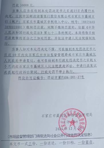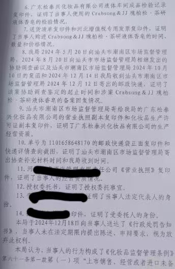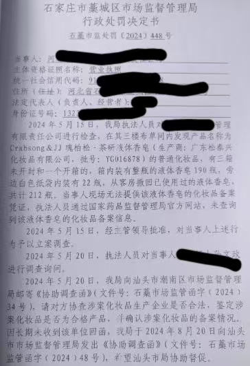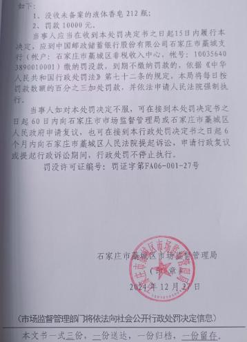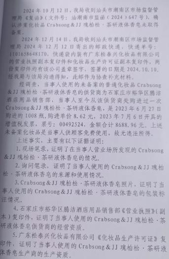 河北卓睿酒店管理有限责任公司经营未备案的Crabsong&JJ瑰柏松·茶研液体香皂案 石藁市监处罚〔2024〕448号