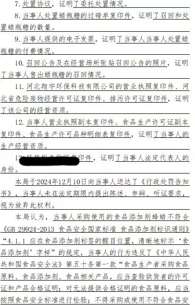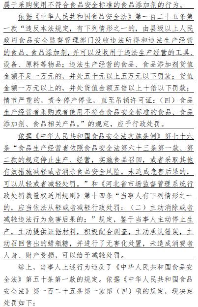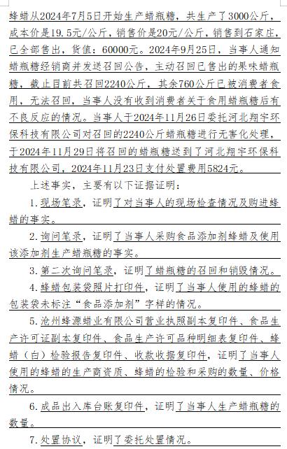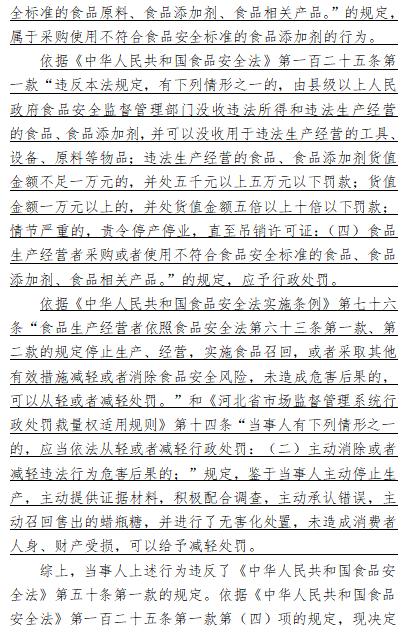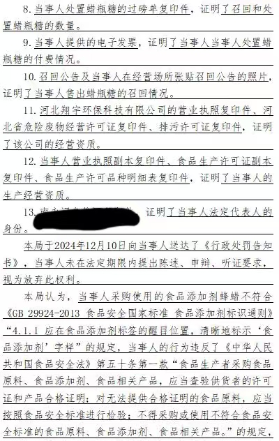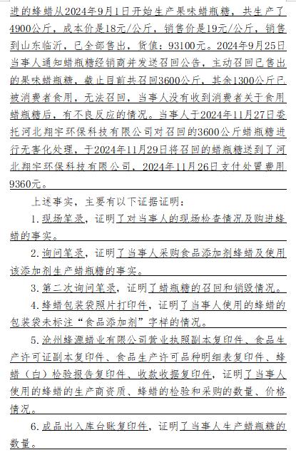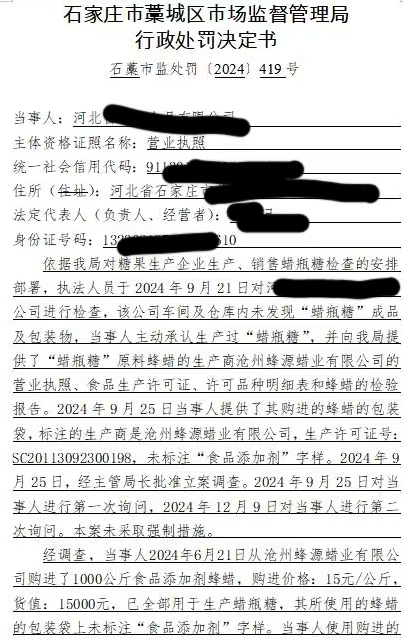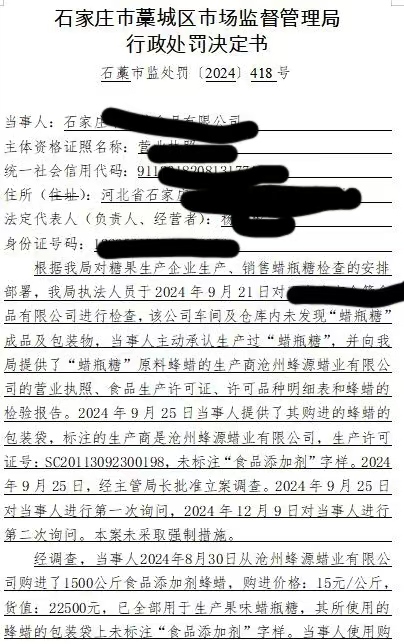 河北百味佳食品有限公司采购使用不符合食品安全标准的食品添加剂蜂蜡生产销售蜡瓶糖案 石藁市监处罚〔2024〕419号