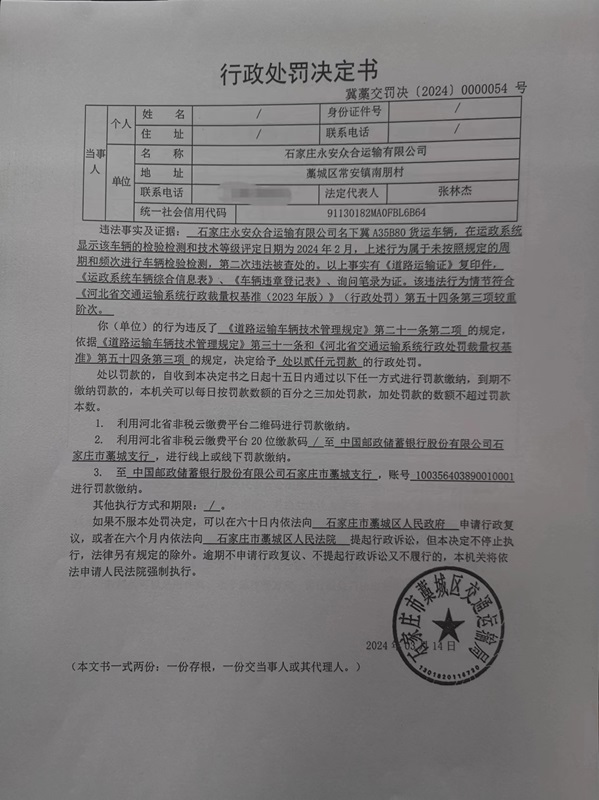 | 石家庄永安众合运输有限公司 | 法人及非法人组织 | 91130182MA0FBL9B64 | 张林杰 | 身份证 | 130182********1516 | 冀藳交罚决【2024】0000054号 | 《道路运输车辆技术管理规定》 | 冀A35B80货运经营者未按规定的周期和频次进行车辆综合性能检测和技术等级评定 | 《河北省交通运输系统行政处罚裁量权基准》第五十四条第三项 | 责令改正、罚款 | 0.2 | 2024.03.14 | 藁城区交通运输局 | FA06-002-15 |