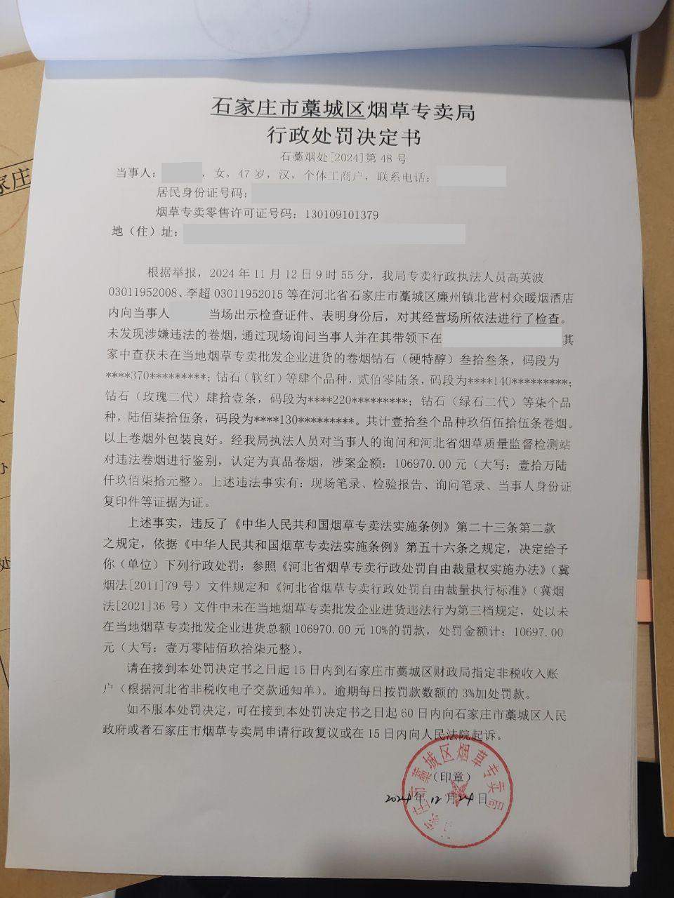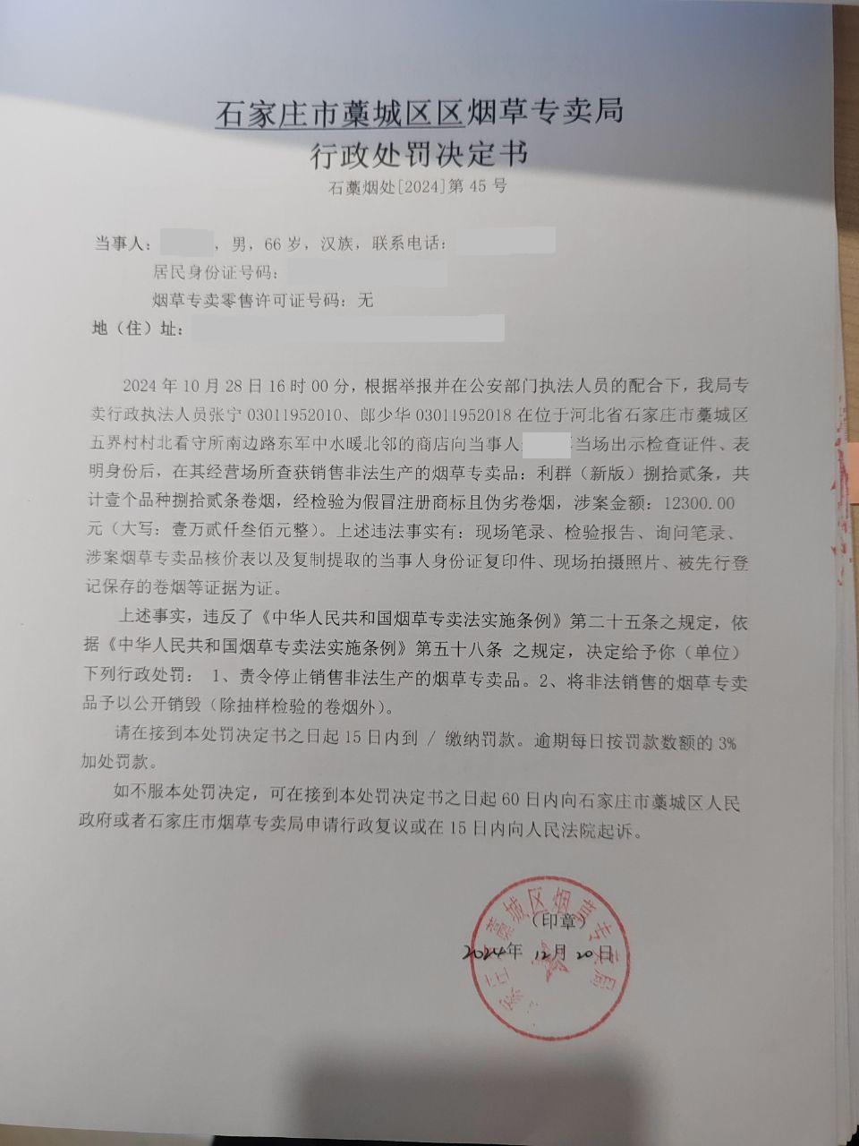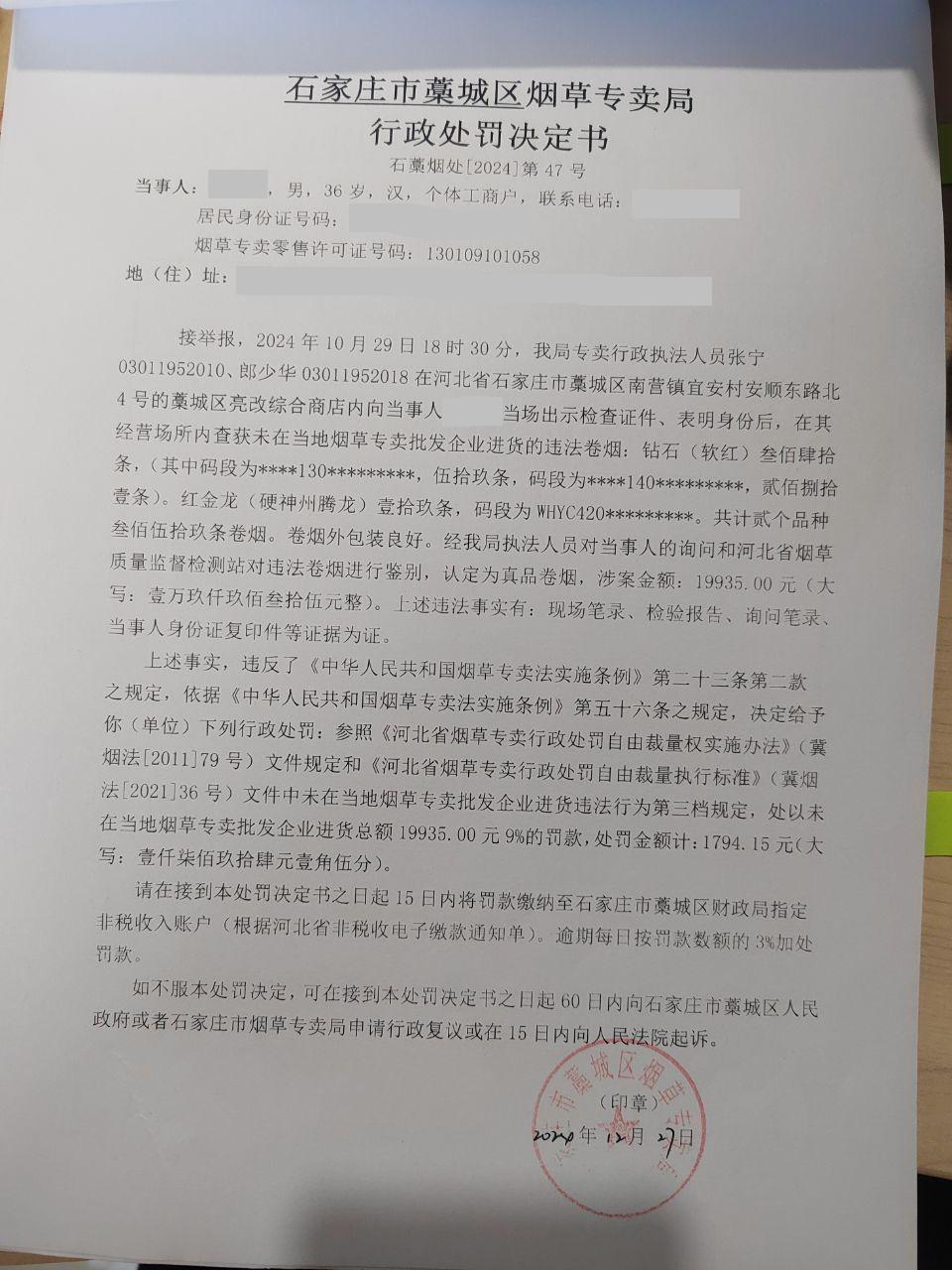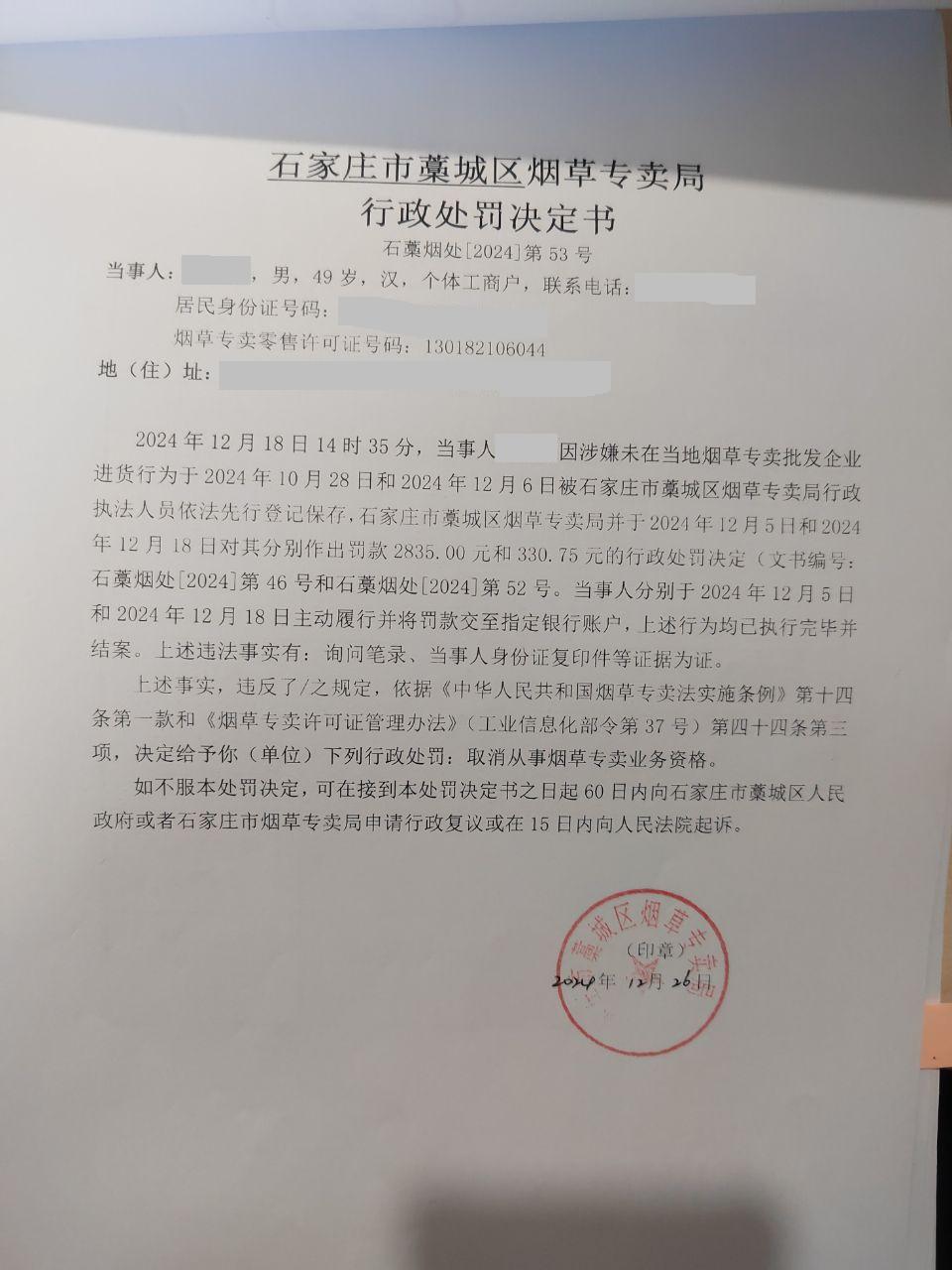 藁城区烟草专卖局2024年12月第4周行政处罚案件公示
