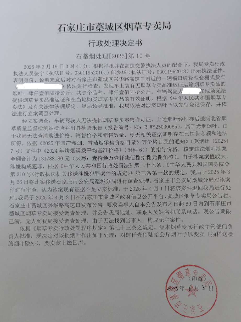 | 石藁烟处[2025]第10号 | 无主 | 无烟草专卖品准运证运输烟草专卖品 | 查获无主无烟草专卖品准运证运输烟草专卖品 | 《中华人民共和国行政处罚法》第二十七条、《中华人民共和国国务院令第310号<行政执法机关移送涉嫌犯罪案件的规定>》第三条第一款的规定 | 其他 | 《烟草专卖行政处罚程序规定》第七十三条之规定 | 变卖上缴 | 2025年6月5日 | 行政处罚 | 石家庄市藁城区烟草专卖局 |