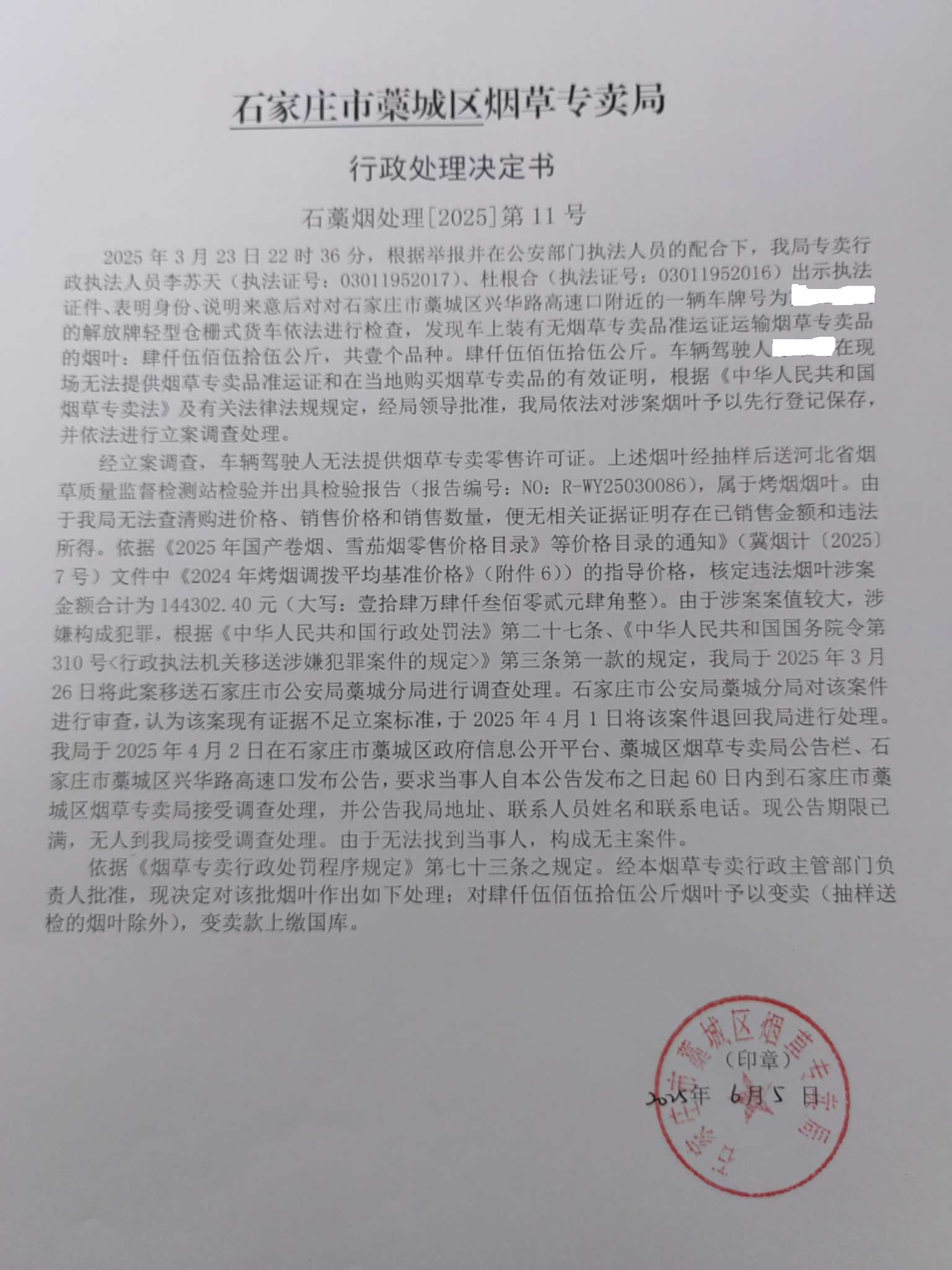 | 石藁烟处[2025]第11号 | 无主 | 无烟草专卖品准运证运输烟草专卖品 | 查获无主无烟草专卖品准运证运输烟草专卖品 | 《中华人民共和国行政处罚法》第二十七条、《中华人民共和国国务院令第311号<行政执法机关移送涉嫌犯罪案件的规定>》第三条第一款的规定 | 其他 | 《烟草专卖行政处罚程序规定》第七十三条之规定 | 变卖上缴 | 2025年6月5日 | 行政处罚 | 石家庄市藁城区烟草专卖局 |