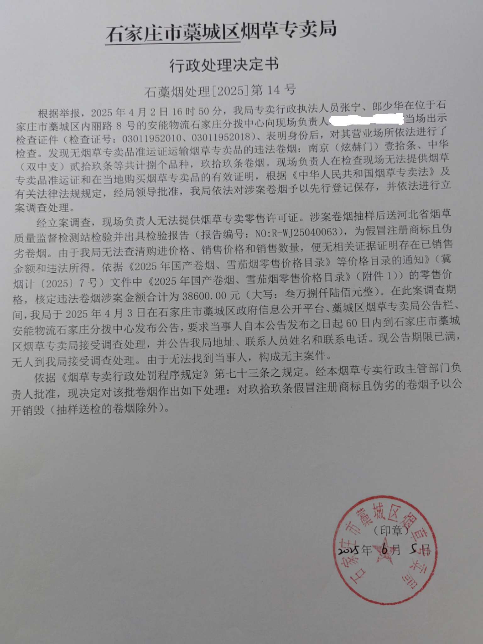 藁城区烟草专卖局2025年6月第1周行政处罚案件公示
