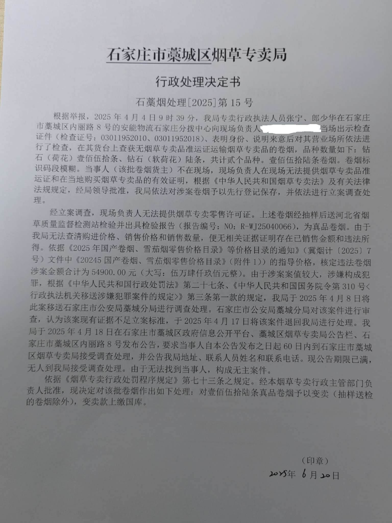 藁城区烟草专卖局2025年6月第3周行政处罚案件公示