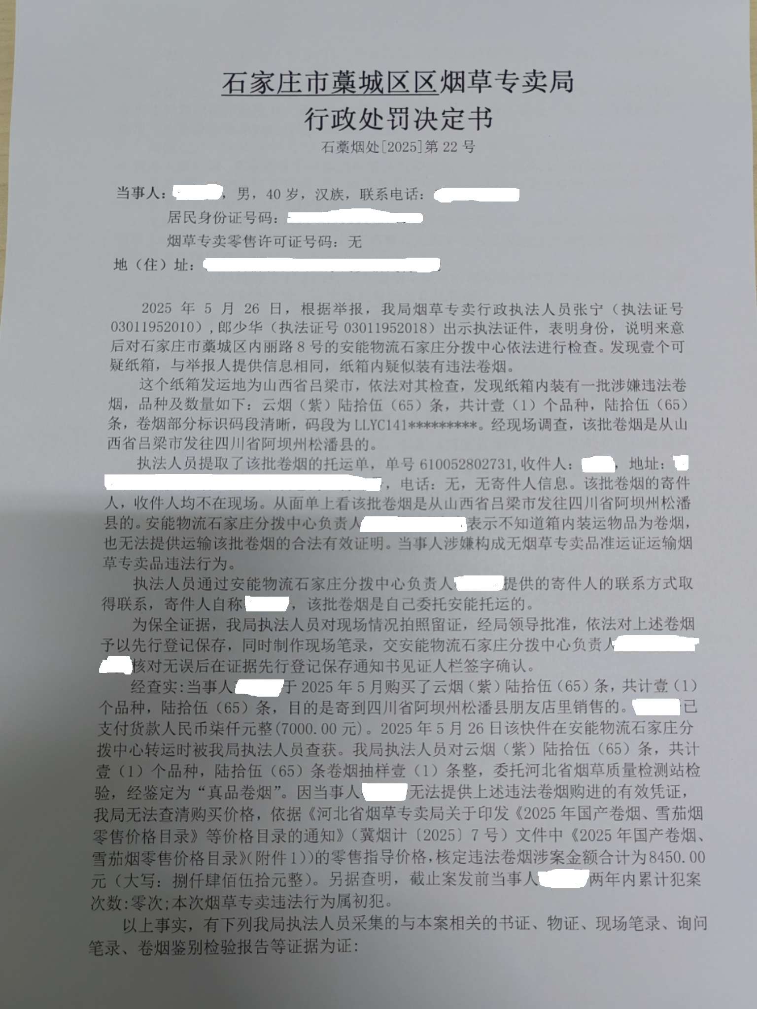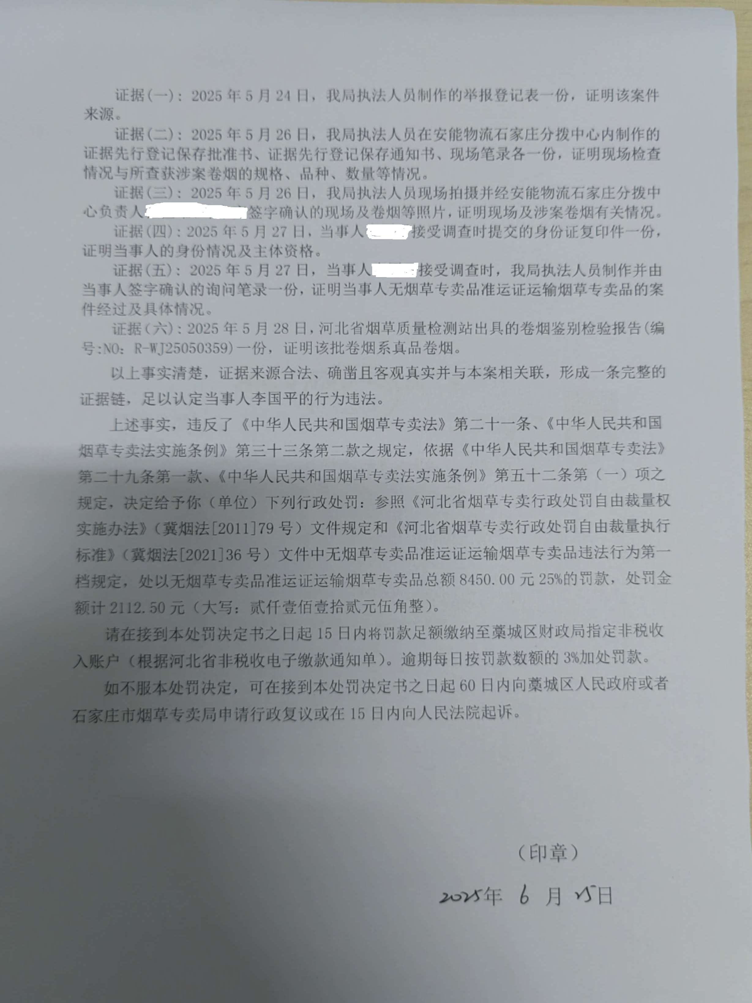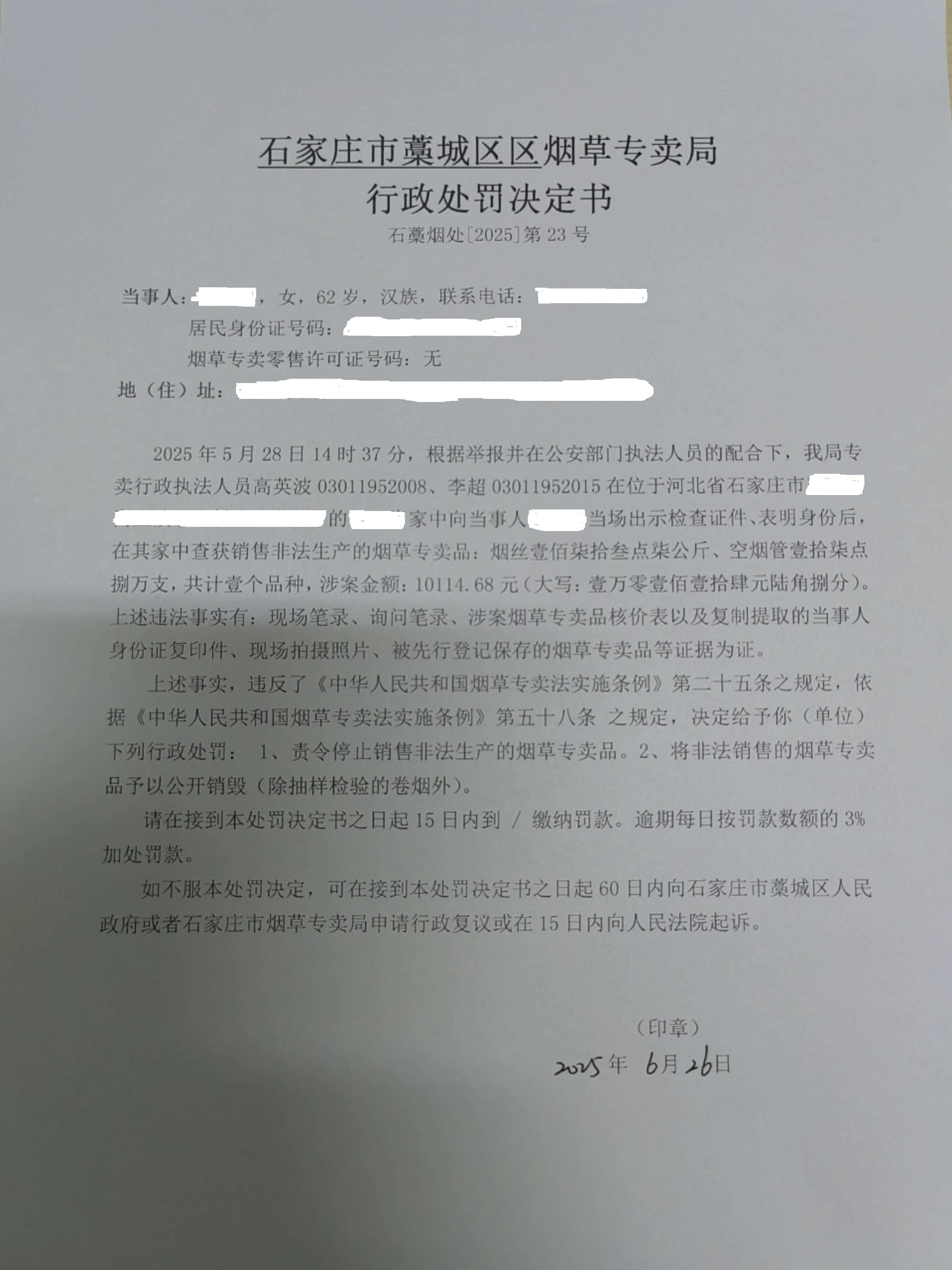 藁城区烟草专卖局2025年6月第4周行政处罚案件公示
