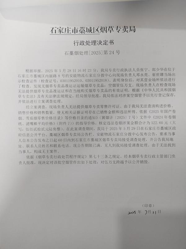 | 石藁烟处[2025]第24号 | 无主 | 无烟草专卖品准运证运输烟草专卖品 | 查获无主无烟草专卖品准运证运输烟草专卖品 | 《中华人民共和国烟草专卖法》第二十一条、《中华人民共和国烟草专卖法实施条例》第三十三条第二款 | 其他 | 《烟草专卖行政处罚程序规定》第七十三条之规定 | 公开销毁 | 2025年7月31日 | 行政处罚 | 石家庄市藁城区烟草专卖局 |