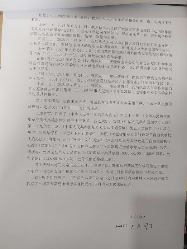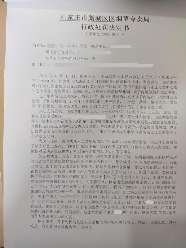 藁城区烟草专卖局2025年8月第1周行政处罚案件公示