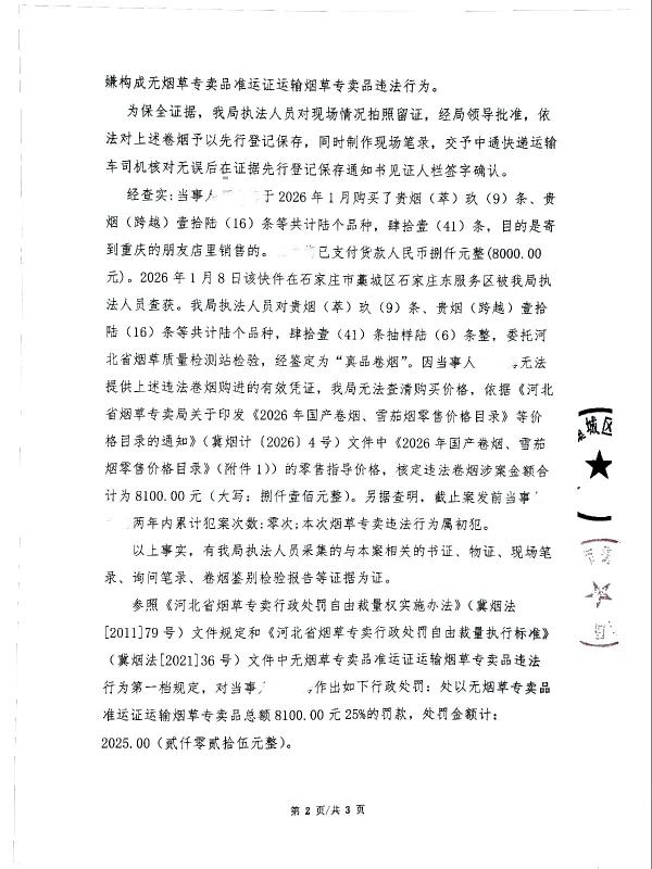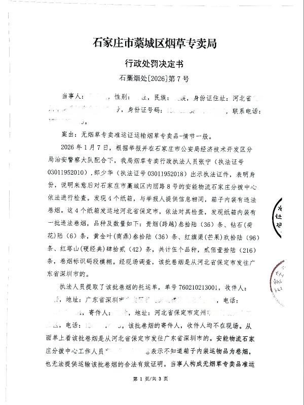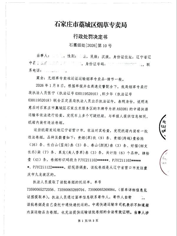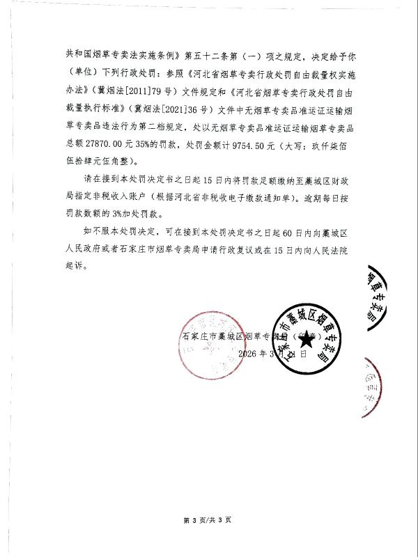 | 石藁烟处[2026]第7号 | 王*龙 | 无烟草专卖品准运证运输烟草专卖品 | 查获王*龙无烟草专卖品准运证运输烟草专卖品 | 《中华人民共和国烟草专卖法》第二十一条、《中华人民共和国烟草专卖法实施条例》第三十三条、第三十四条 | 罚款 | 《中华人民共和国烟草专卖法》第二十九条第一款、《中华人民共和国烟草专卖法实施条例》第五十二条第(一)项之规定,《河北省烟草专卖行政处罚自由裁量权实施办法》冀烟法【2011】79号文件及《河北省烟草专卖行政处罚自由裁量执行标准》冀烟法【2021】36号文件 | 罚款9754.50元 | 2026年3月11日 | 行政处罚 | 石家庄市藁城区烟草专卖局 |