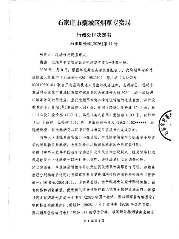 | 石藁烟处[2026]第11号 | 无主 | 无烟草专卖品准运证运输烟草专卖品 | 查获无主无烟草专卖品准运证运输烟草专卖品 | 《中华人民共和国烟草专卖法》第二十一条、《中华人民共和国烟草专卖法实施条例》第三十三条、第三十四条 | 其他 | 《烟草专卖行政处罚程序规定》第七十三条之规定 | 予以变卖,变卖款上缴国库 | 2026年3月18日 | 行政处理 | 石家庄市藁城区烟草专卖局 |