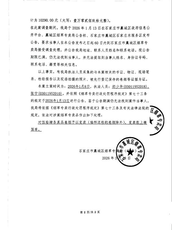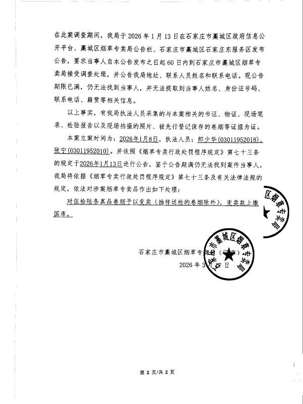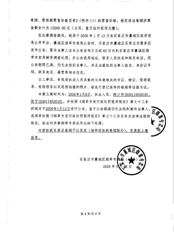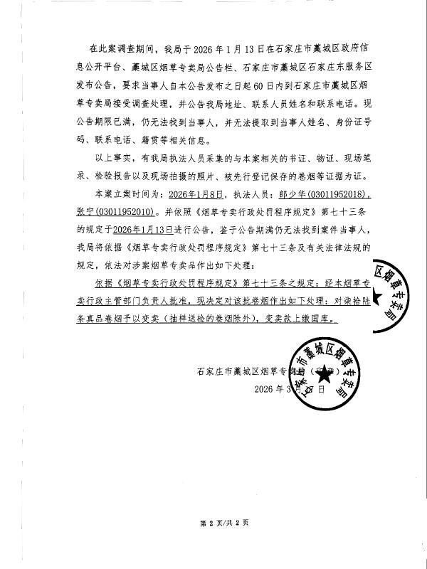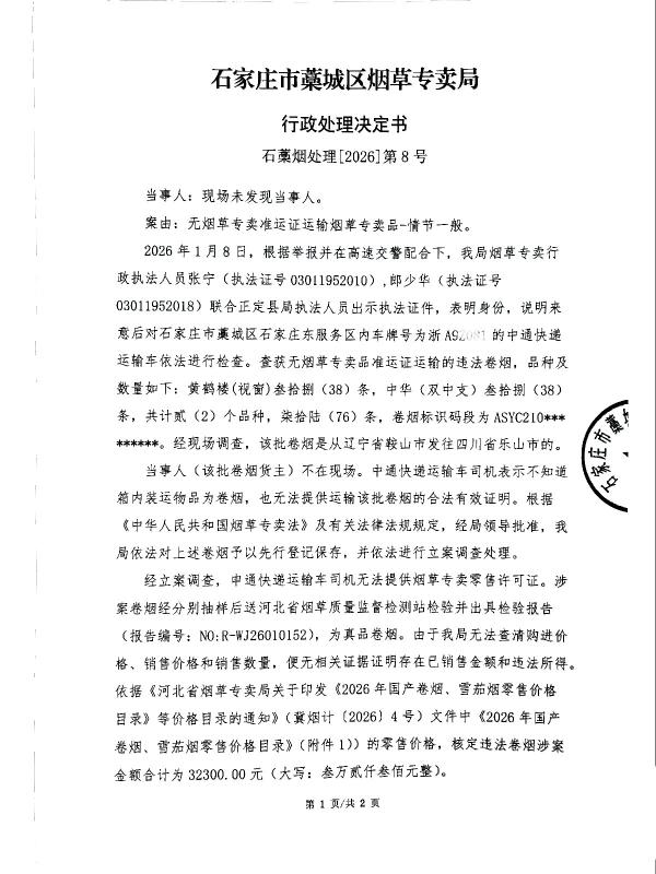| 石藁烟处[2026]第8号 | 无主 | 无烟草专卖品准运证运输烟草专卖品 | 查获无主无烟草专卖品准运证运输烟草专卖品 | 《中华人民共和国烟草专卖法》第二十一条、《中华人民共和国烟草专卖法实施条例》第三十三条、第三十四条 | 其他 | 《烟草专卖行政处罚程序规定》第七十三条之规定 | 予以变卖,变卖款上缴国库 | 2026年3月17日 | 行政处理 | 石家庄市藁城区烟草专卖局 |