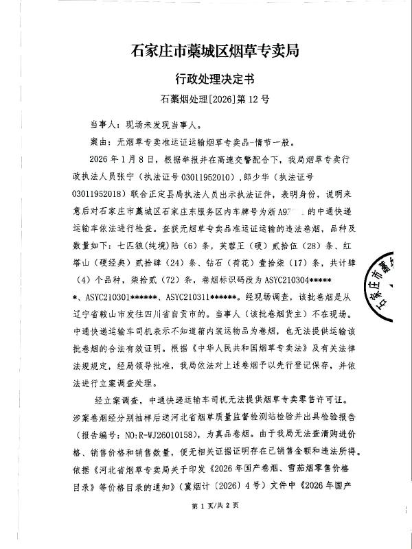 | 石藁烟处[2026]第12号 | 无主 | 无烟草专卖品准运证运输烟草专卖品 | 查获无主无烟草专卖品准运证运输烟草专卖品 | 《中华人民共和国烟草专卖法》第二十一条、《中华人民共和国烟草专卖法实施条例》第三十三条、第三十四条 | 其他 | 《烟草专卖行政处罚程序规定》第七十三条之规定 | 予以变卖,变卖款上缴国库 | 2026年3月18日 | 行政处理 | 石家庄市藁城区烟草专卖局 |