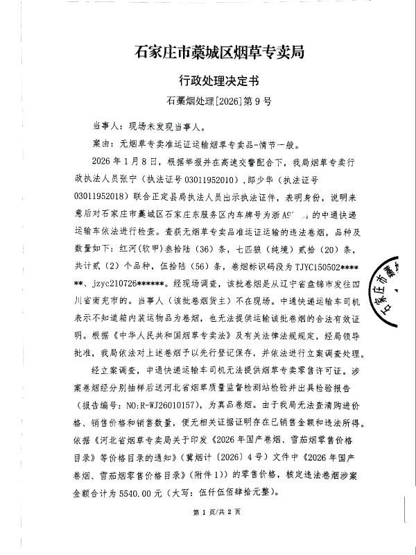 | 石藁烟处[2026]第9号 | 无主 | 无烟草专卖品准运证运输烟草专卖品 | 查获无主无烟草专卖品准运证运输烟草专卖品 | 《中华人民共和国烟草专卖法》第二十一条、《中华人民共和国烟草专卖法实施条例》第三十三条、第三十四条 | 其他 | 《烟草专卖行政处罚程序规定》第七十三条之规定 | 予以变卖,变卖款上缴国库 | 2026年3月17日 | 行政处理 | 石家庄市藁城区烟草专卖局 |