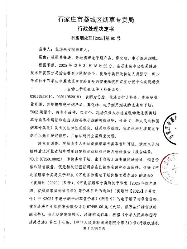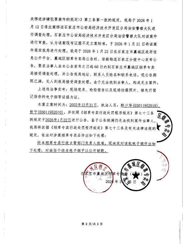 | 石藁烟处[2025]第90号 | 无主 | 超限量寄递、异地携带电子产品、雾化物、电子烟用烟碱 | 查获无主超限量寄递、异地携带电子产品、雾化物、电子烟用烟碱 | 《中华人民共和国烟草专卖法》第二十一条、《中华人民共和国烟草专卖法实施条例》第三十三条、第三十四条 | 其他 | 《烟草专卖行政处罚程序规定》第七十三条之规定 | 对柒佰个伪劣电子烟予以公开销毁 | 2026年3月25日 | 行政处理 | 石家庄市藁城区烟草专卖局 |
