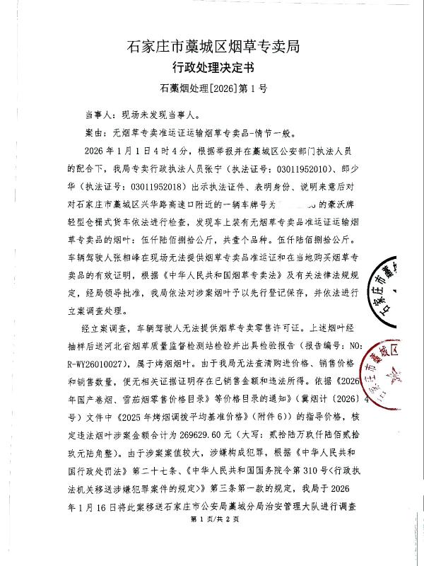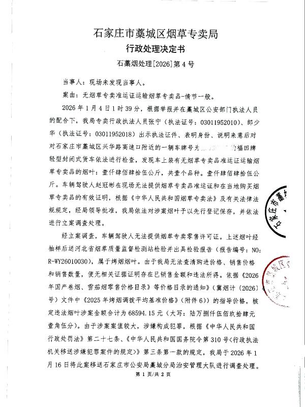 | 石藁烟处[2026]第1号 | 无主 | 无烟草专卖品准运证运输烟草专卖品 | 查获无主无烟草专卖品准运证运输烟草专卖品 | 《中华人民共和国烟草专卖法》第二十一条、《中华人民共和国烟草专卖法实施条例》第三十三条、第三十四条 | 其他 | 《烟草专卖行政处罚程序规定》第七十三条之规定 | 予以变卖,变卖款上缴国库 | 2026年3月24日 | 行政处理 | 石家庄市藁城区烟草专卖局 |
