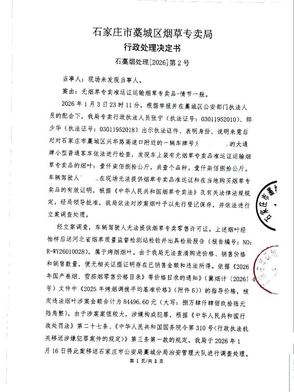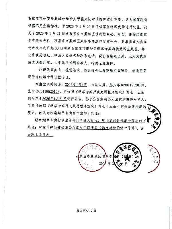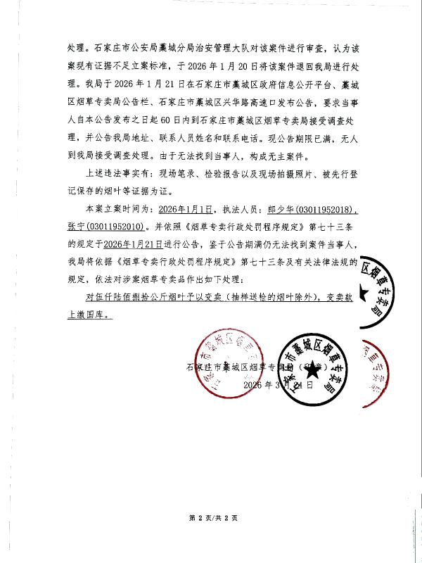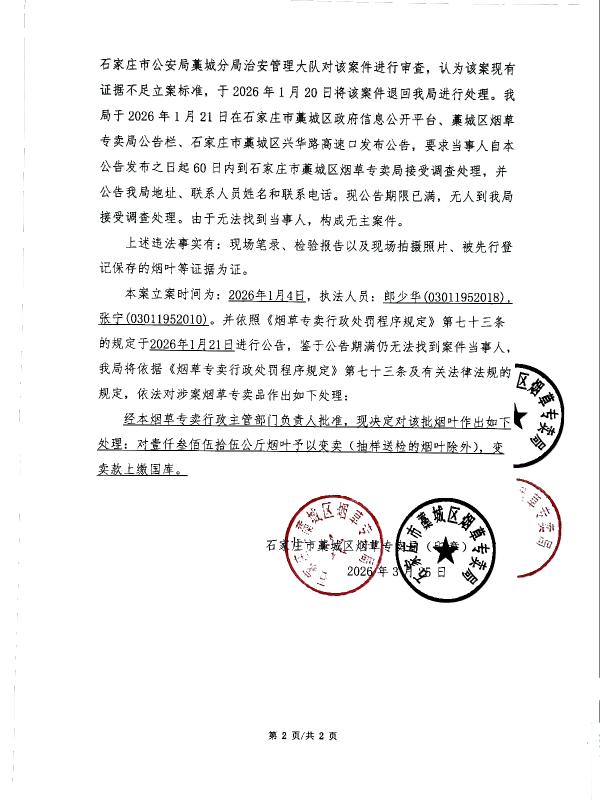 | 石藁烟处[2026]第2号 | 无主 | 无烟草专卖品准运证运输烟草专卖品 | 查获无主无烟草专卖品准运证运输烟草专卖品 | 《中华人民共和国烟草专卖法》第二十一条、《中华人民共和国烟草专卖法实施条例》第三十三条、第三十四条 | 其他 | 《烟草专卖行政处罚程序规定》第七十三条之规定 | 予以变卖,变卖款上缴国库 | 2026年3月25日 | 行政处理 | 石家庄市藁城区烟草专卖局 |