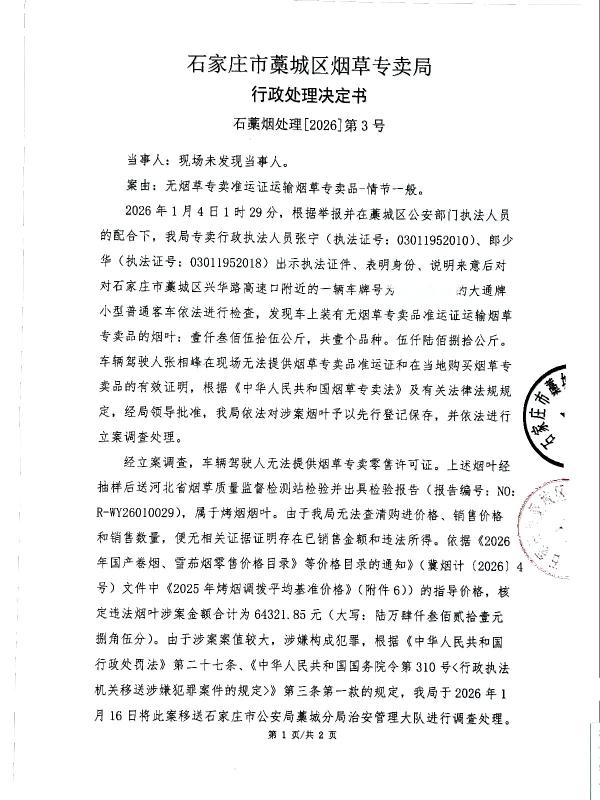 | 石藁烟处[2026]第3号 | 无主 | 无烟草专卖品准运证运输烟草专卖品 | 查获无主无烟草专卖品准运证运输烟草专卖品 | 《中华人民共和国烟草专卖法》第二十一条、《中华人民共和国烟草专卖法实施条例》第三十三条、第三十四条 | 其他 | 《烟草专卖行政处罚程序规定》第七十三条之规定 | 予以变卖,变卖款上缴国库 | 2026年3月25日 | 行政处理 | 石家庄市藁城区烟草专卖局 |