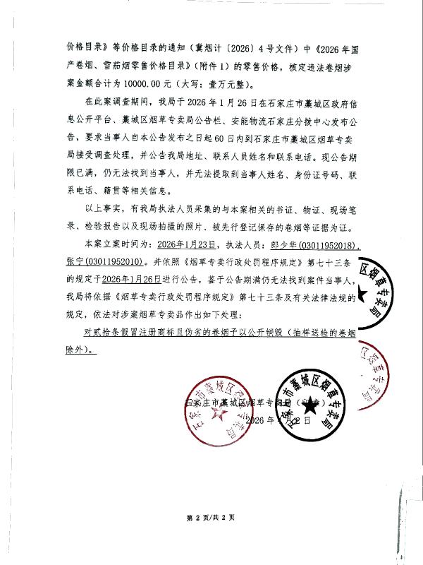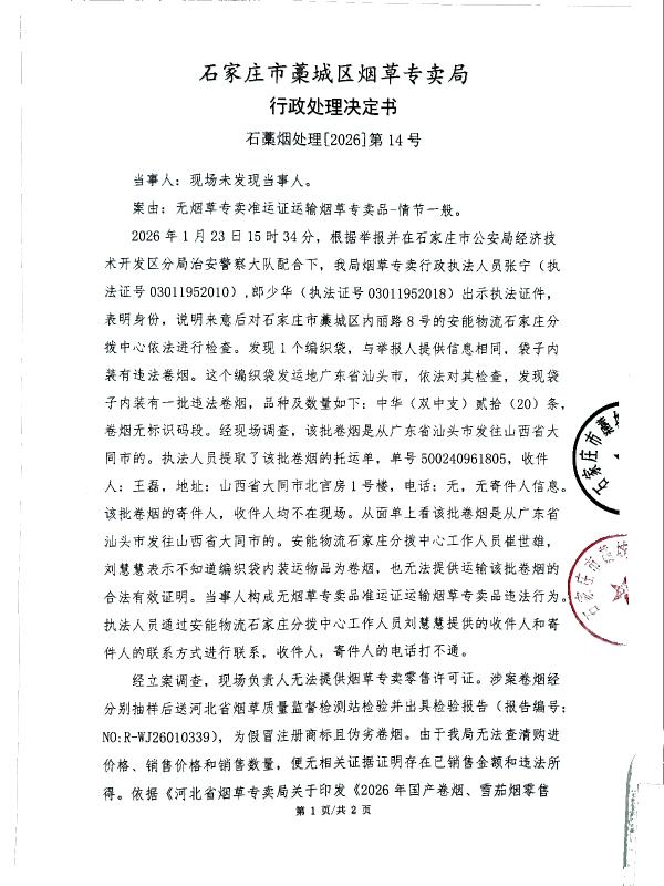 | 石藁烟处[2026]第14号 | 无主 | 无烟草专卖品准运证运输烟草专卖品 | 查获无主无烟草专卖品准运证运输烟草专卖品 | 《中华人民共和国烟草专卖法》第二十一条、《中华人民共和国烟草专卖法实施条例》第三十三条、第三十四条 | 其他 | 《烟草专卖行政处罚程序规定》第七十三条之规定 | 对贰拾条假冒注册商标且伪劣的卷烟予以公开销毁 | 2026年4月2日 | 行政处理 | 石家庄市藁城区烟草专卖局 |