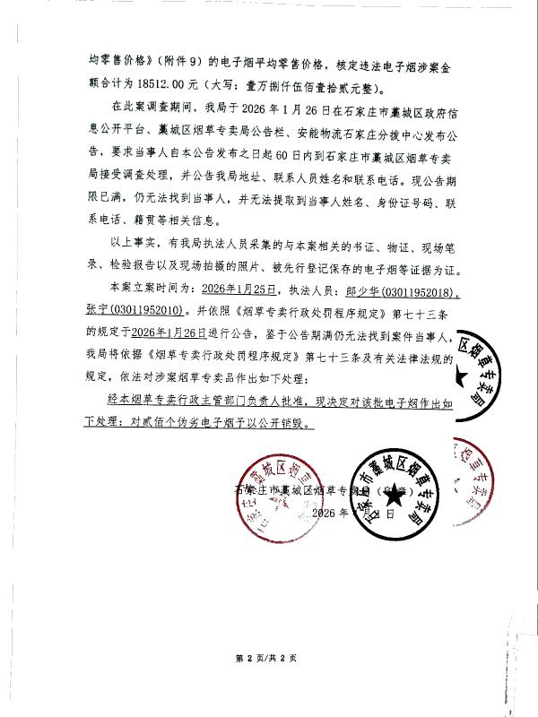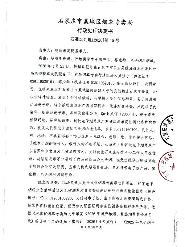 | 石藁烟处[2026]第15号 | 无主 | 超限量寄递、异地携带电子产品、雾化物、电子烟用烟碱 | 查获无主超限量寄递、异地携带电子产品、雾化物、电子烟用烟碱 | 《中华人民共和国烟草专卖法》第二十一条、《中华人民共和国烟草专卖法实施条例》第三十三条、第三十四条 | 其他 | 《烟草专卖行政处罚程序规定》第七十三条之规定 | 对贰佰个伪劣电子烟予以公开销毁 | 2026年4月1日 | 行政处理 | 石家庄市藁城区烟草专卖局 |