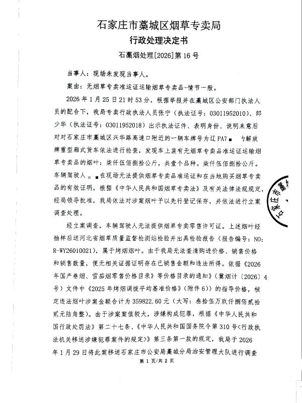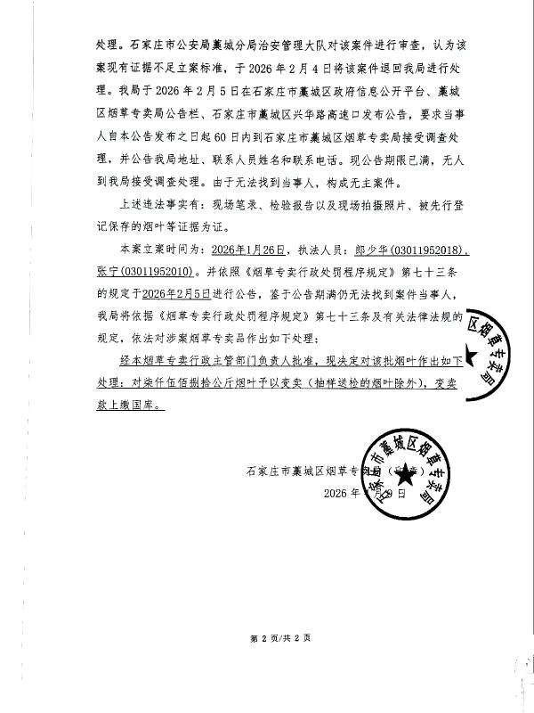 | 石藁烟处[2026]第16号 | 无主 | 无烟草专卖品准运证运输烟草专卖品 | 查获无主无烟草专卖品准运证运输烟草专卖品 | 《中华人民共和国烟草专卖法》第二十一条、《中华人民共和国烟草专卖法实施条例》第三十三条、第三十四条 | 其他 | 《烟草专卖行政处罚程序规定》第七十三条之规定 | 予以变卖,变卖款上缴国库 | 2026年4月9日 | 行政处理 | 石家庄市藁城区烟草专卖局 |
