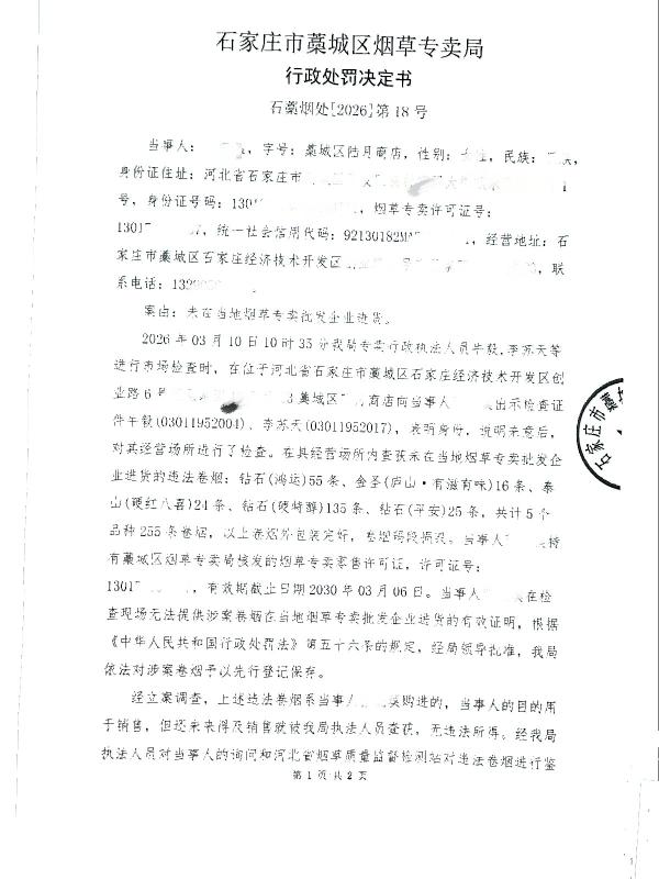 | 石藁烟处[2026]第18号 | 张*璞 | 未在当地烟草专卖批发企业进货 | 查获张*璞未在当地烟草专卖批发企业进货 | 《中华人民共和国烟草专卖法实施条例》第二十三条第二款 | 罚款 | 《河北省烟草专卖行政处罚自由裁量权实施办法》冀烟法【2011】79号文件及《河北省烟草专卖行政处罚自由裁量执行标准》冀烟法【2021】36号文件 | 罚款1255.95元 | 2026年4月14日 | 行政处理 | 石家庄市藁城区烟草专卖局 |