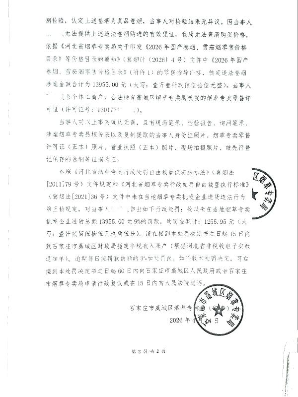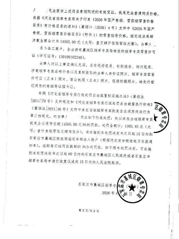 藁城区烟草专卖局2026年04月第3周行政处罚案件公示