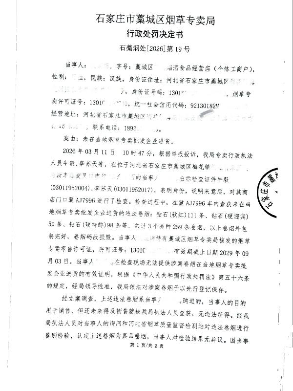 | 石藁烟处[2026]第19号 | 樊*博 | 未在当地烟草专卖批发企业进货 | 查获樊*博未在当地烟草专卖批发企业进货 | 《中华人民共和国烟草专卖法实施条例》第二十三条第二款 | 罚款 | 《河北省烟草专卖行政处罚自由裁量权实施办法》冀烟法【2011】79号文件及《河北省烟草专卖行政处罚自由裁量执行标准》冀烟法【2021】36号文件 | 罚款1305.45元 | 2026年4月15日 | 行政处理 | 石家庄市藁城区烟草专卖局 |