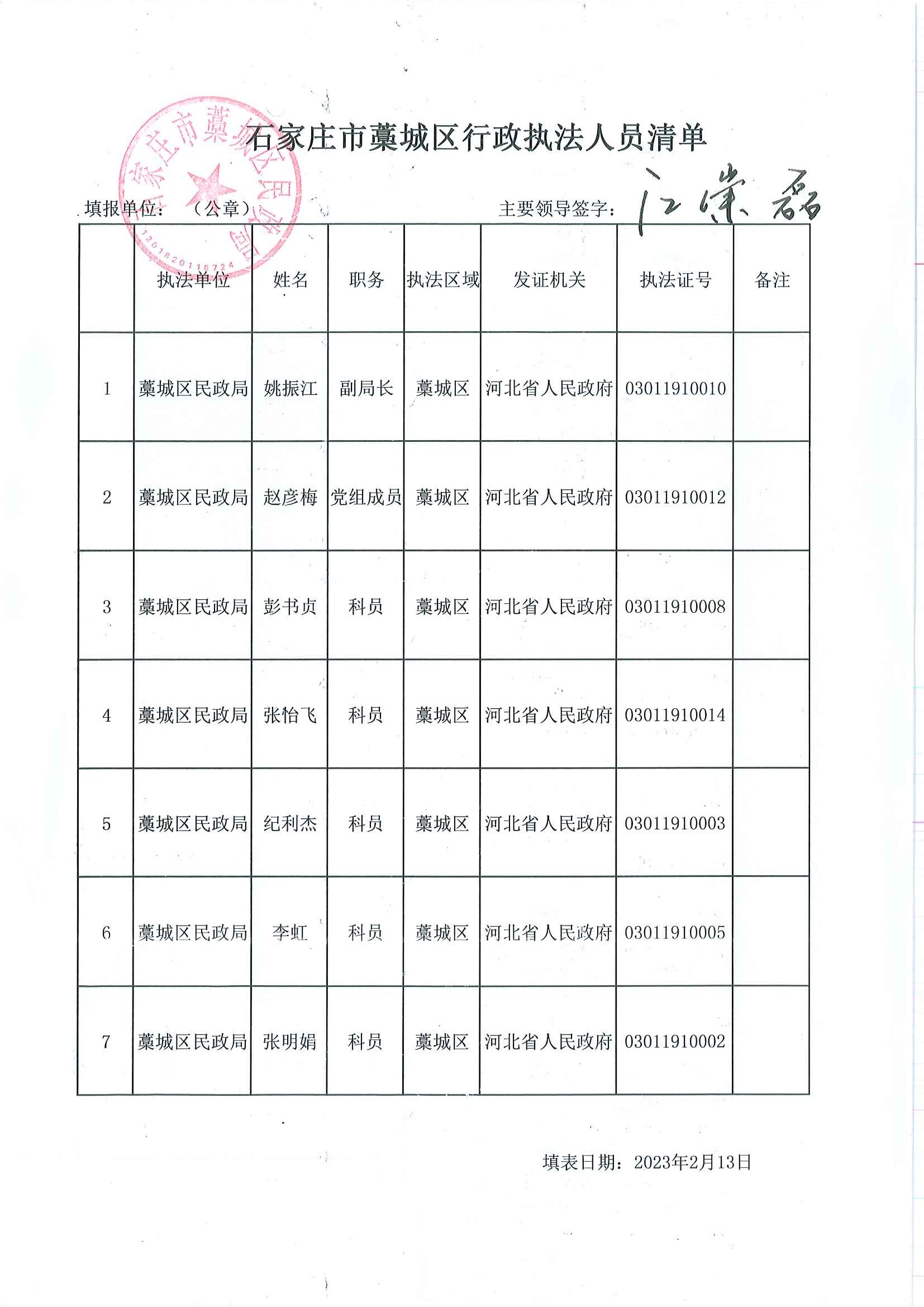 藁城区民政局2023年行政执法人员名单公示