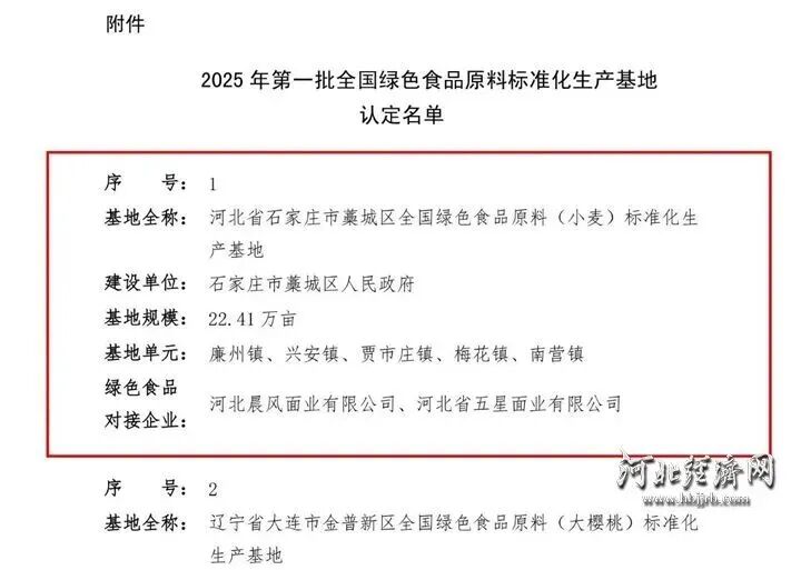 石家庄市藁城区全国绿色食品原料(小麦)标准化生产基地入选全国绿色食品原料标准化生产基地认定名单。
