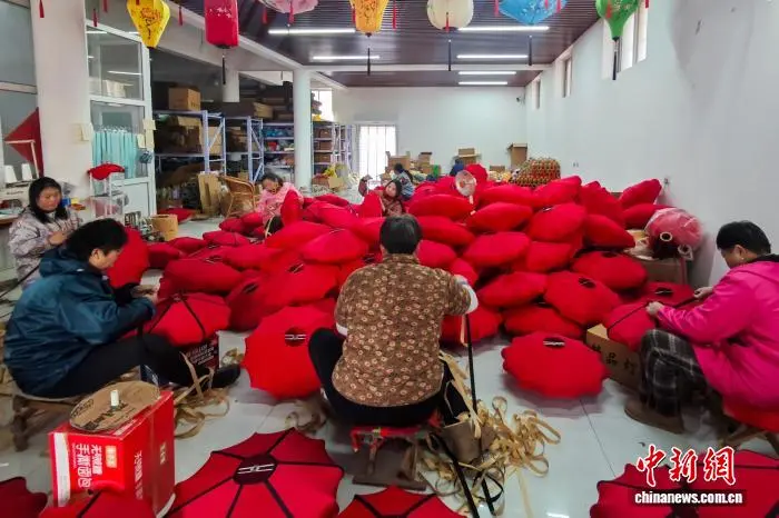随着元旦临近,承载着喜庆、团圆寓意的宫灯迎来了销售旺季。位于河北省石家庄市藁城区的“中国宫灯第一村”屯头村,村民正加紧赶制宫灯,保障市场供应。据了解,屯头村宫灯年产值逾20亿元,除供应国内市场外,产品远销越南、新加坡等10多个国家和地区。目前,屯头村90%的村民从事宫灯及相关产业,周边村镇村民也加入到宫灯零部件生产、加工、销售中,宫灯已然成为当地民众的“致富灯”。图为12月26日,屯头村一宫灯加工企业内,工人正加紧赶制宫灯。