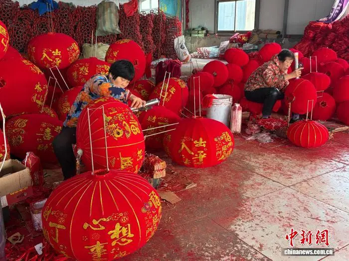 12月26日,屯头村一家灯笼加工厂内,工人们正忙着裱糊红绸、点缀纹饰。 李玉素 摄