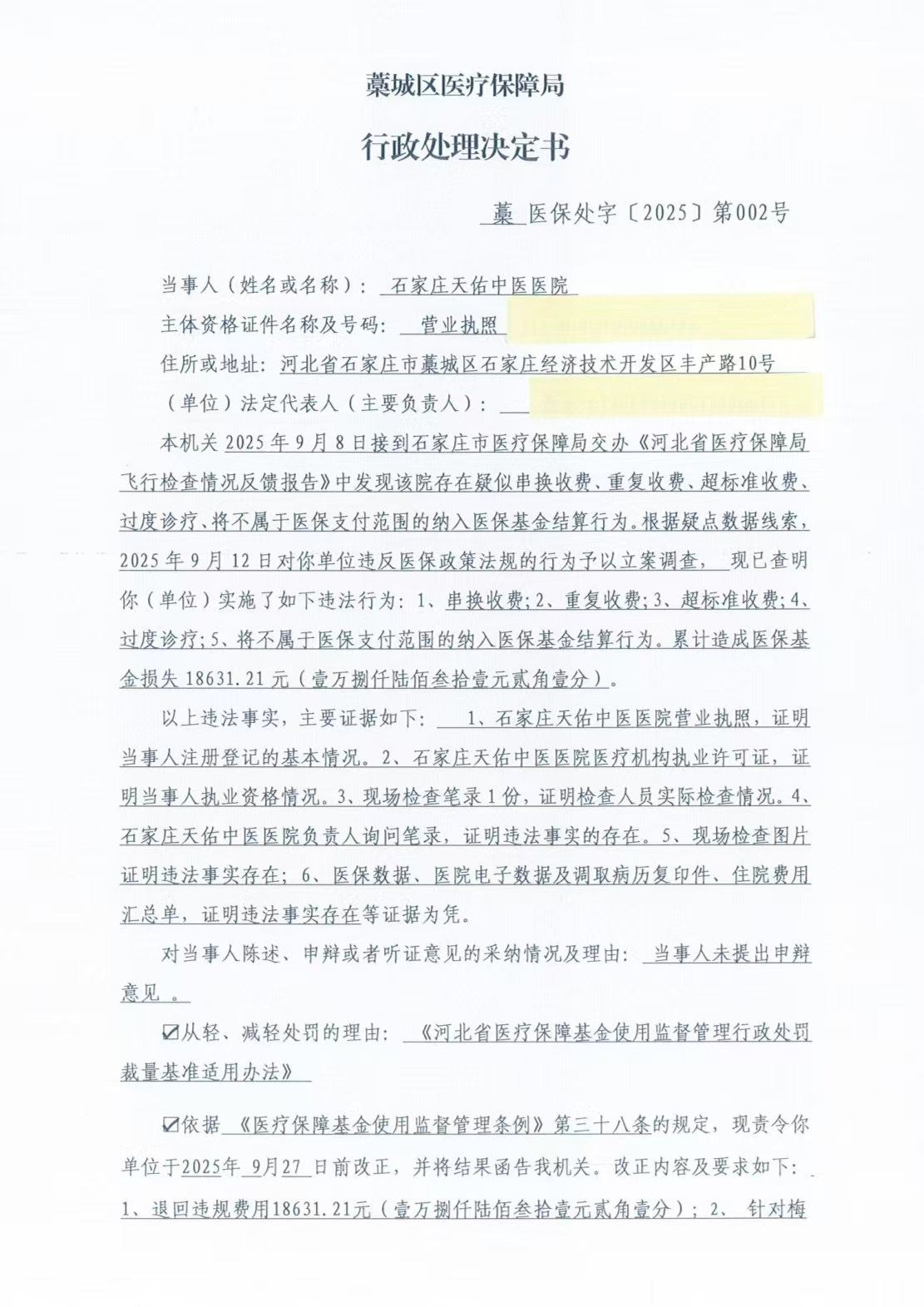 藁城区医疗保障局行政处理决定书藁医保处字〔2025〕第 002 号