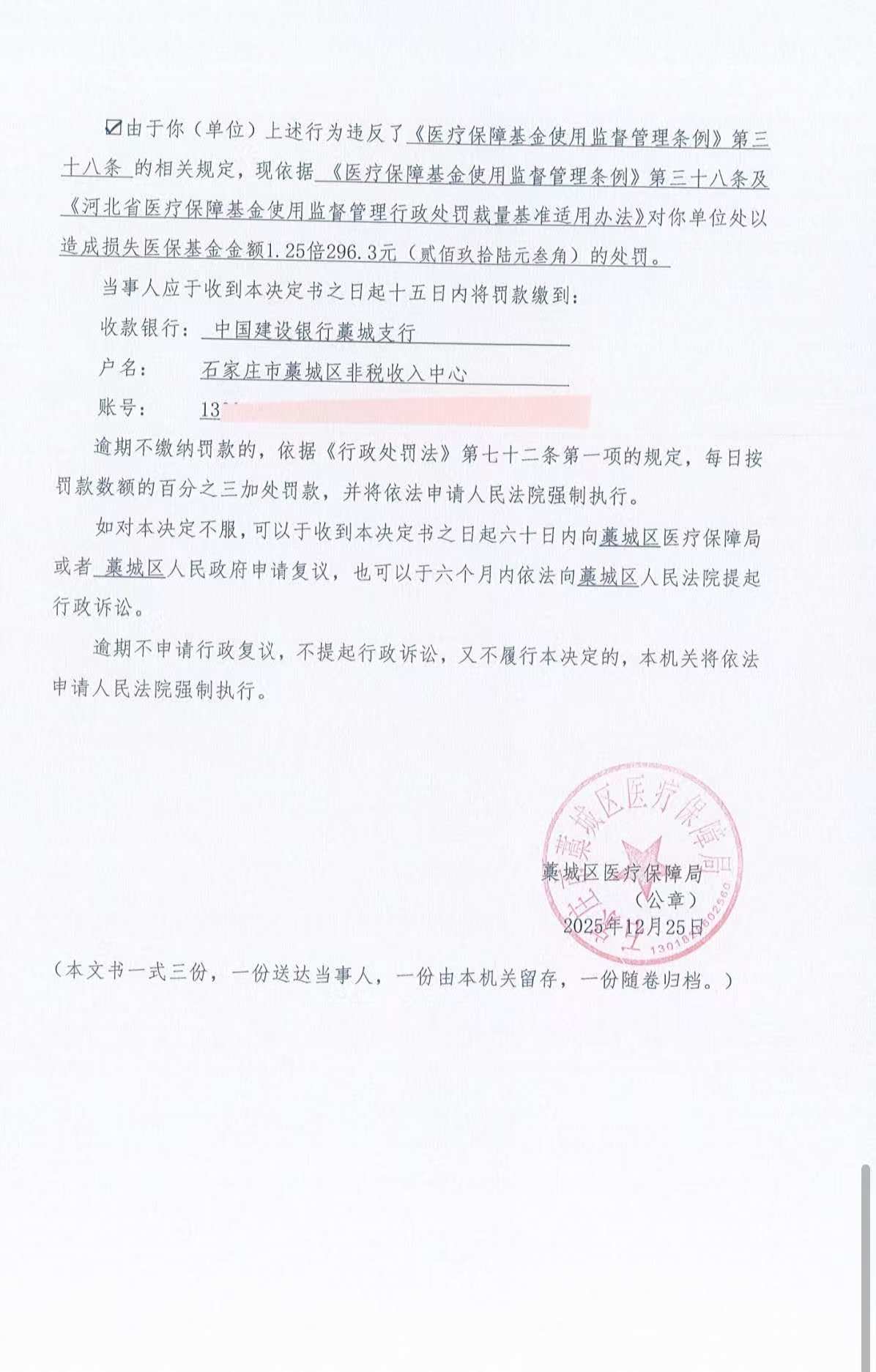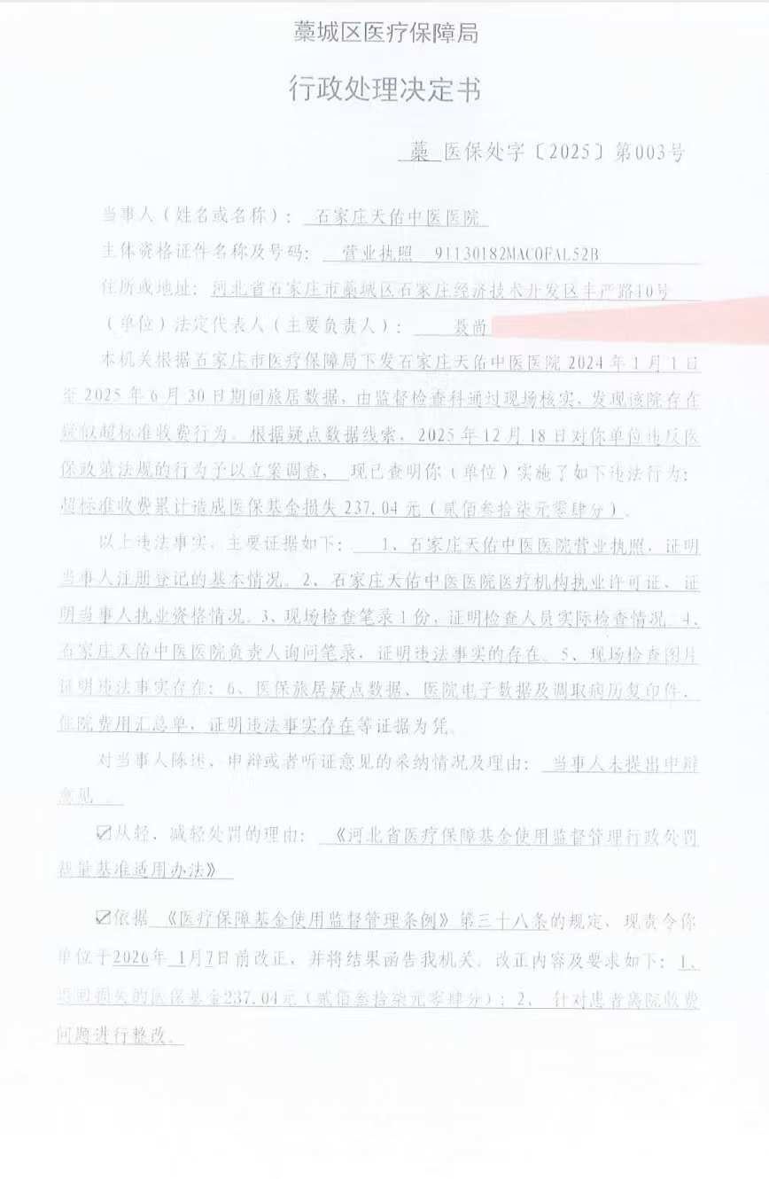 藁城区医疗保障局行政处理决定书藁医保处字〔2025〕第 003 号