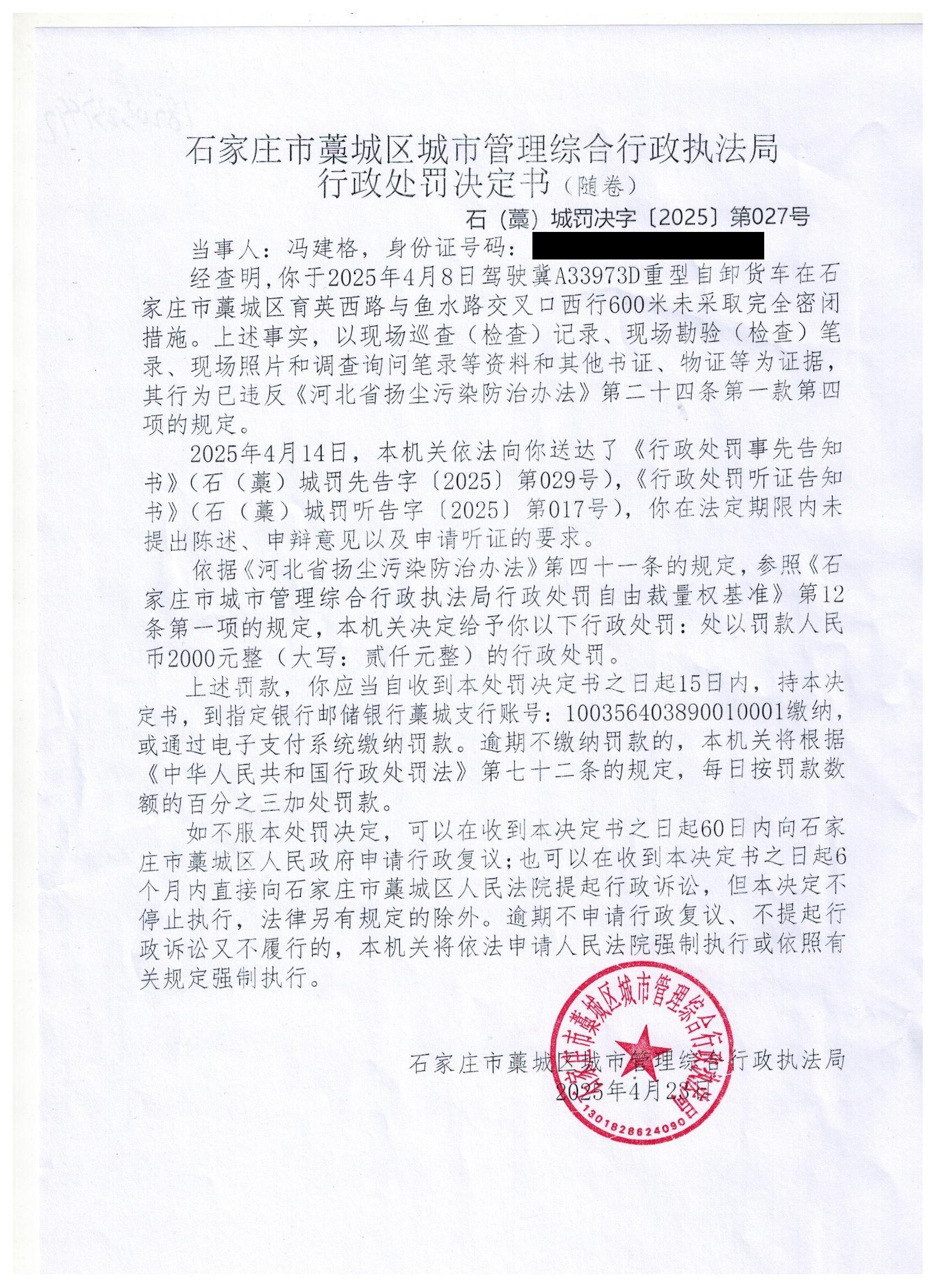 藁城区城市管理综合行政执法局行政处罚决定书027