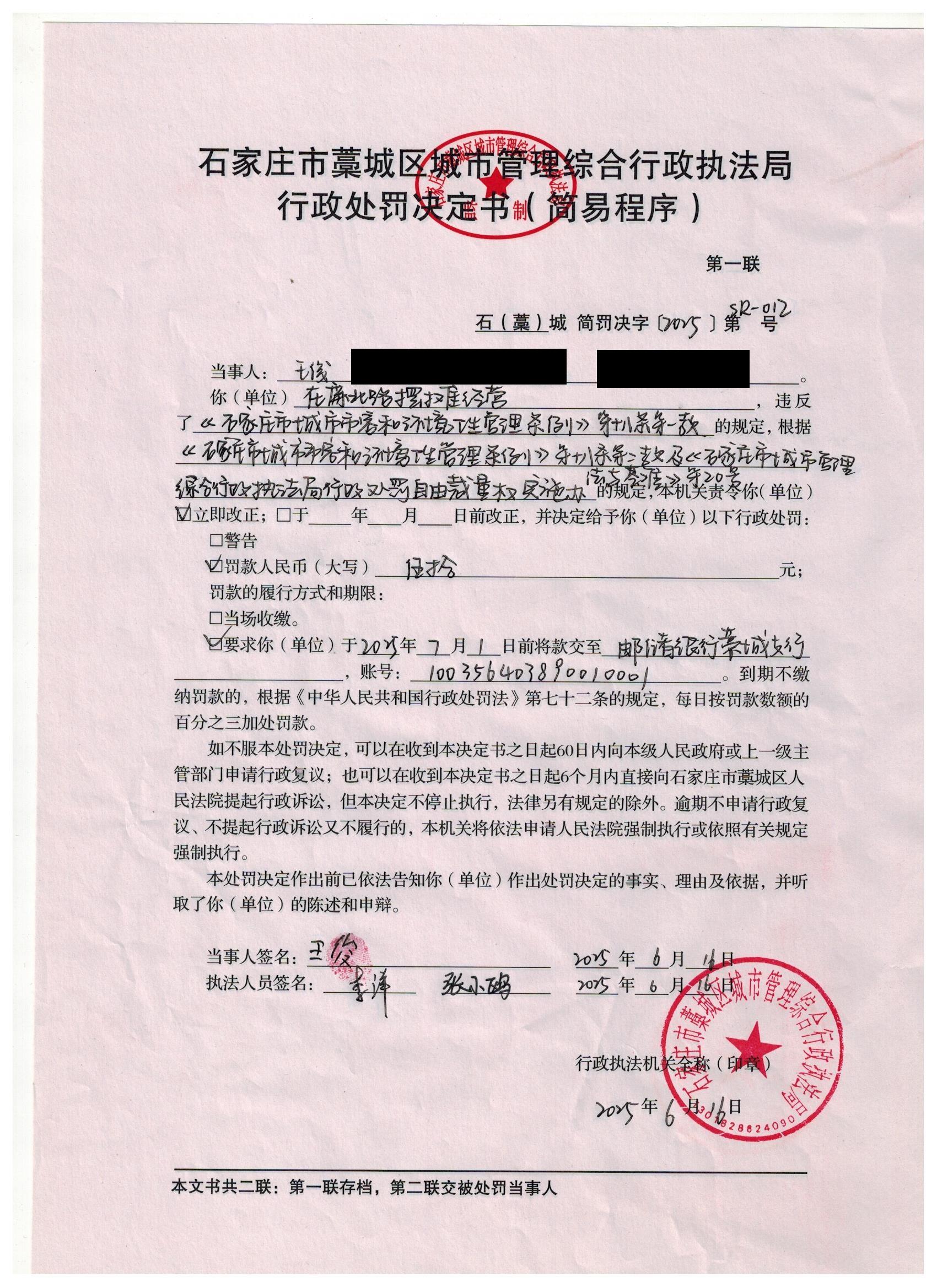 藁城区城市管理综合行政执法局行政处罚决定书简易SR-012