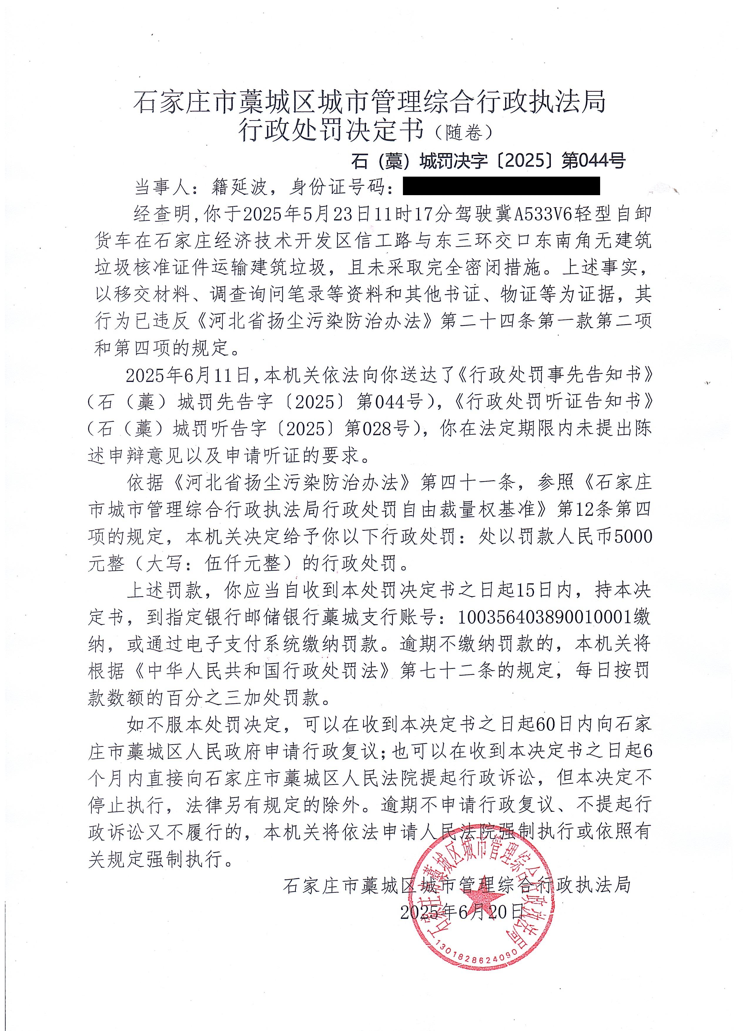 藁城区城市管理综合行政执法局行政处罚决定书044
