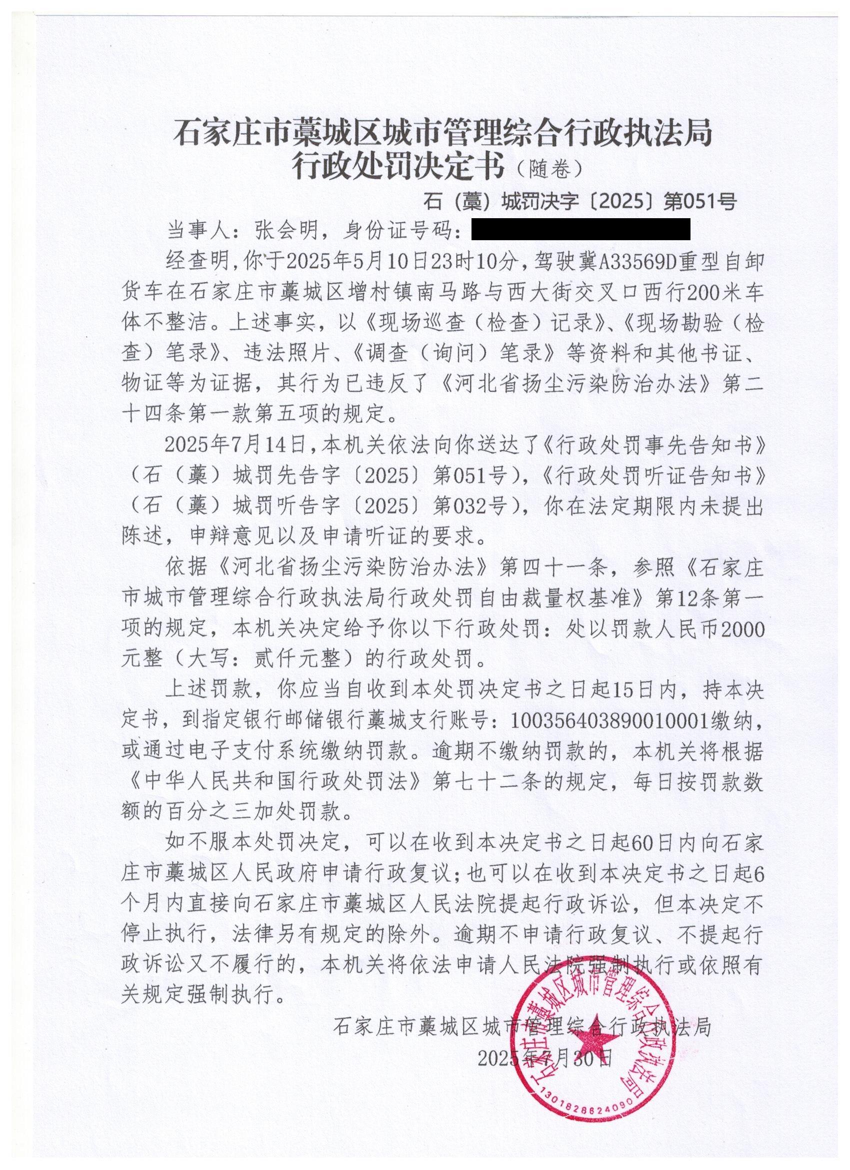 藁城区城市管理综合行政执法局行政处罚决定书051