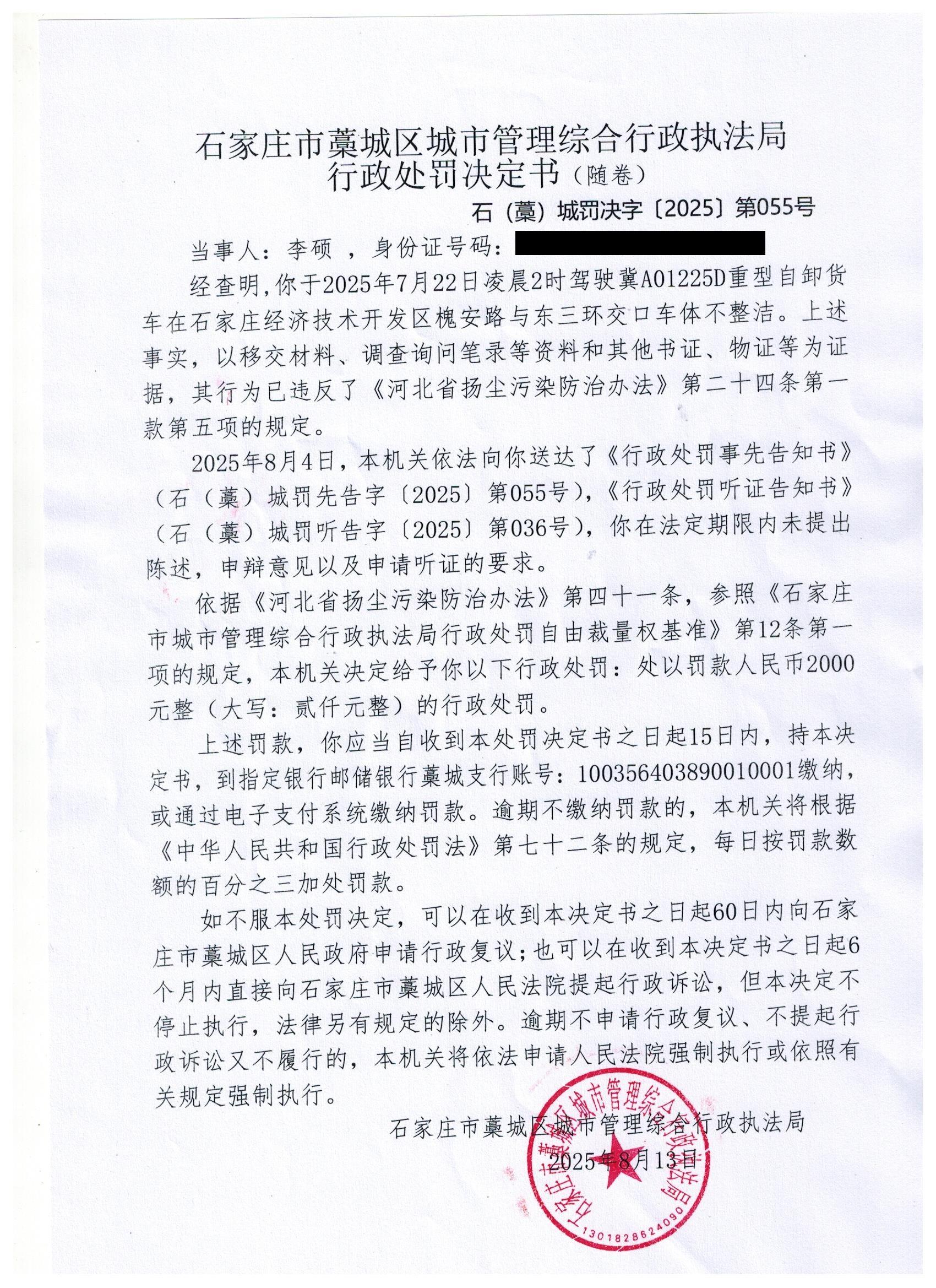 藁城区城市管理综合行政执法局行政处罚决定书055