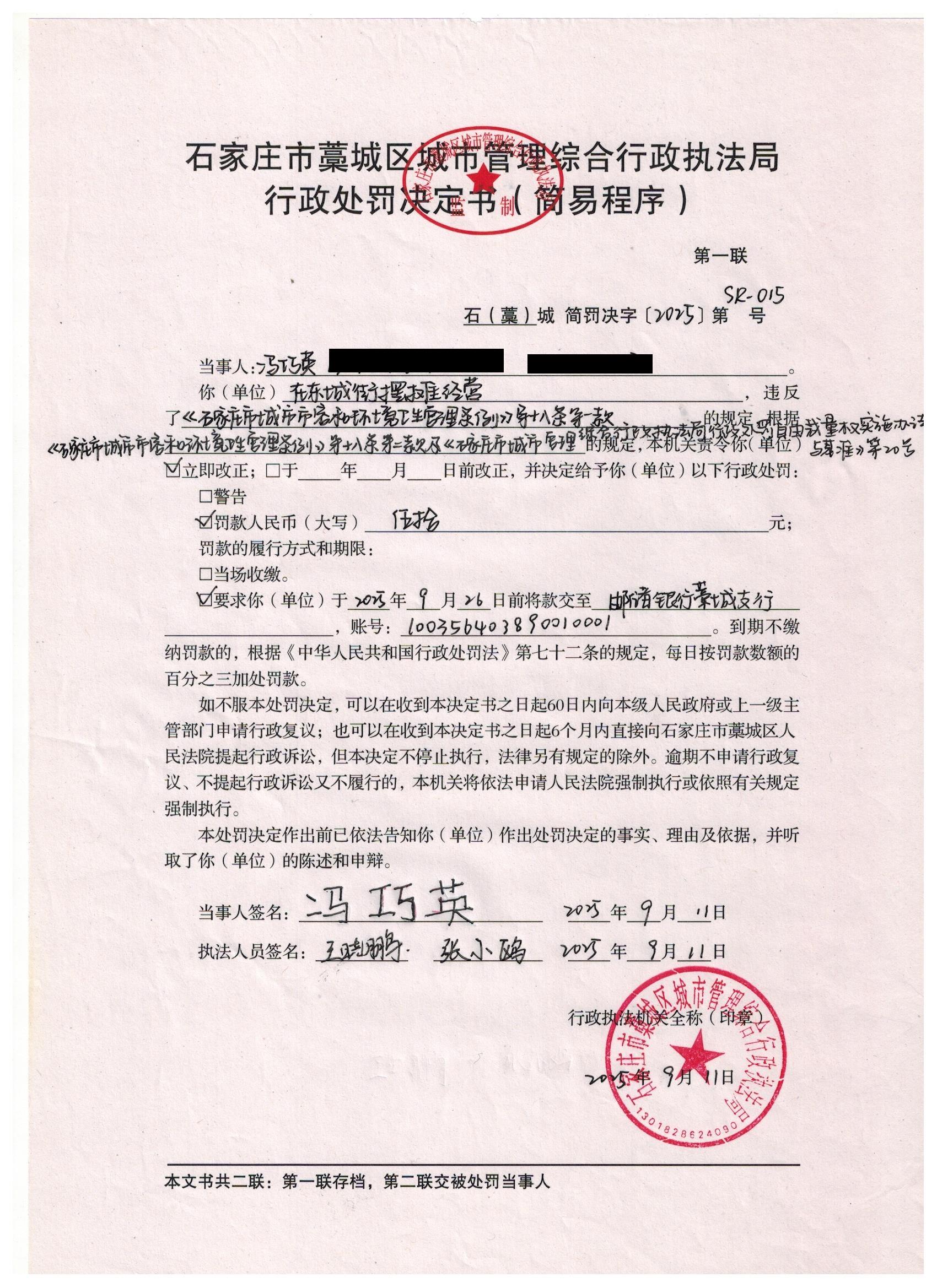 藁城区城市管理综合行政执法局行政处罚决定书简易SR-015