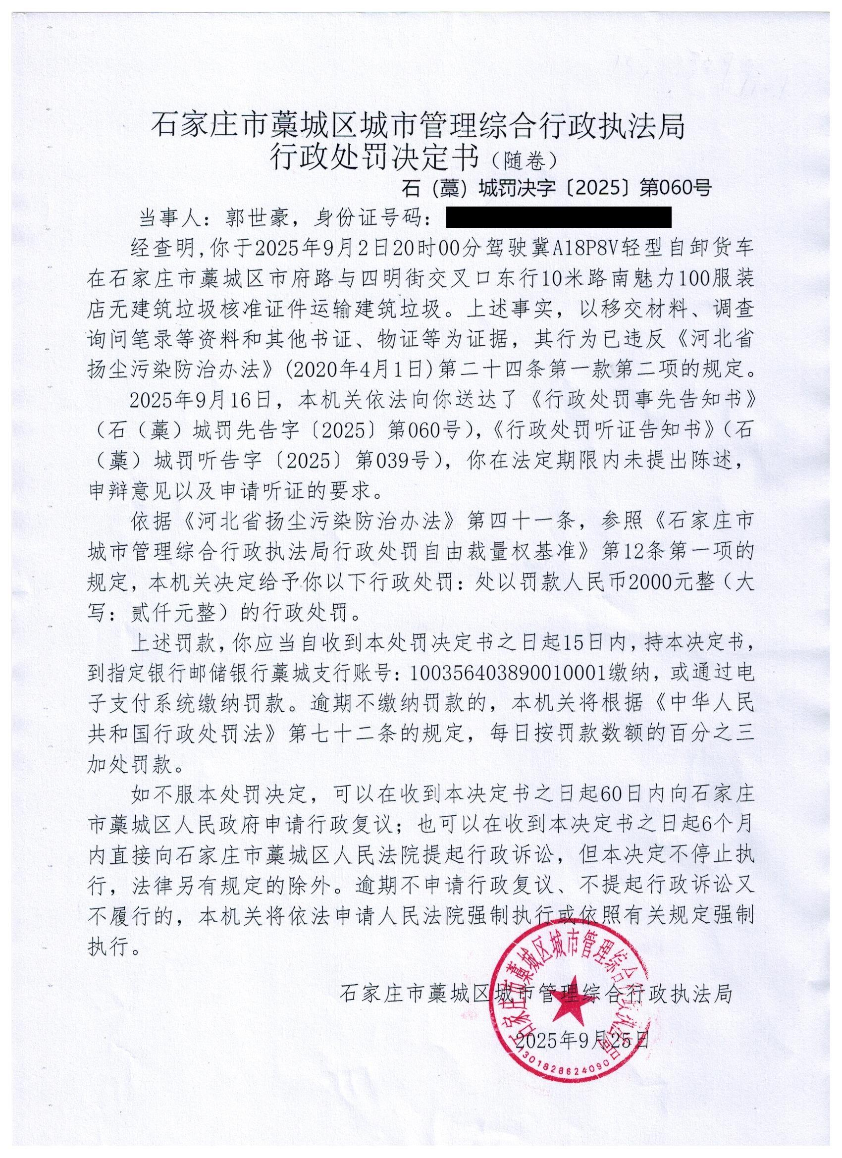 藁城区城市管理综合行政执法局行政处罚决定书060