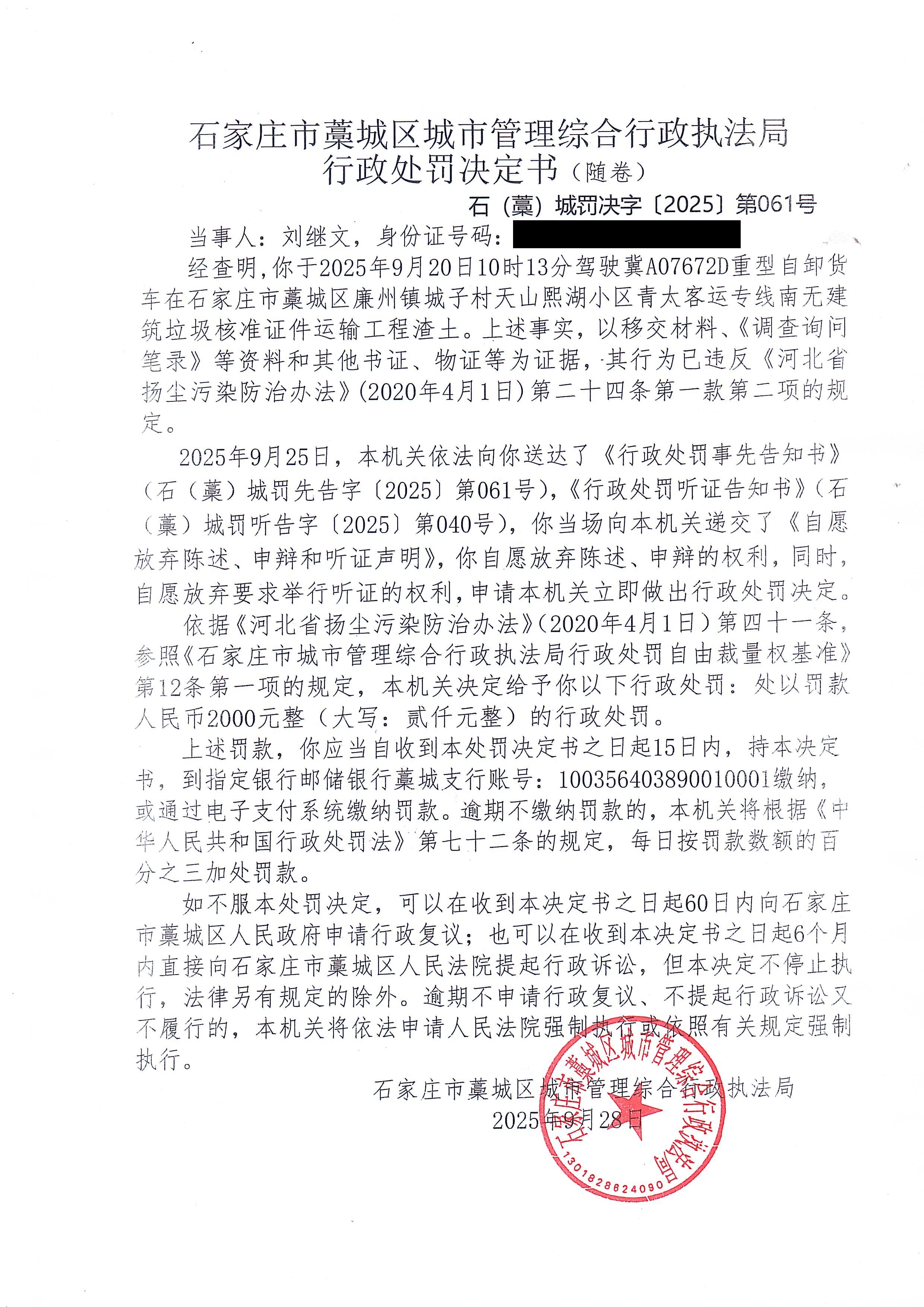 藁城区城市管理综合行政执法局行政处罚决定书061