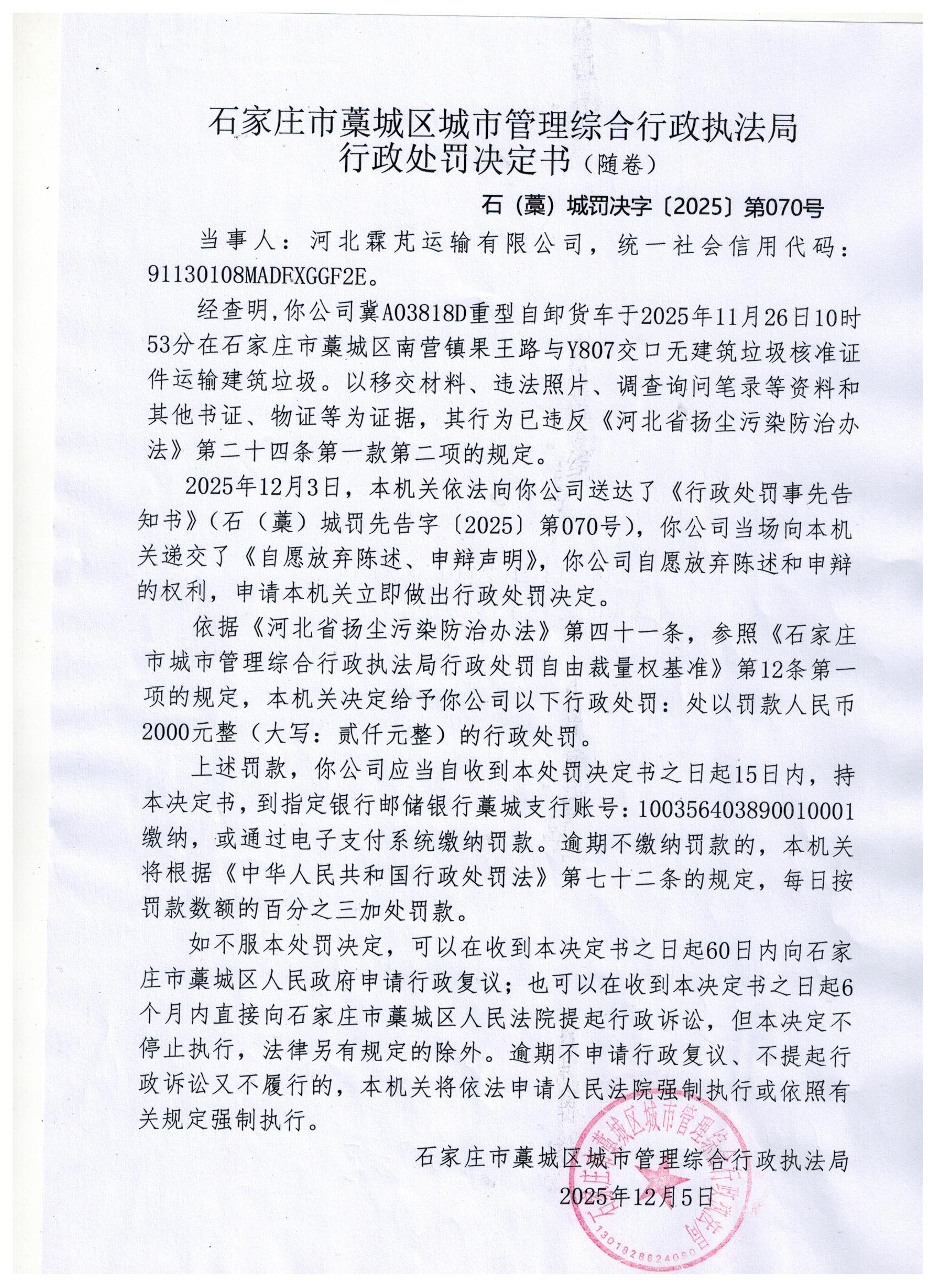 藁城区城市管理综合行政执法局行政处罚决定书070