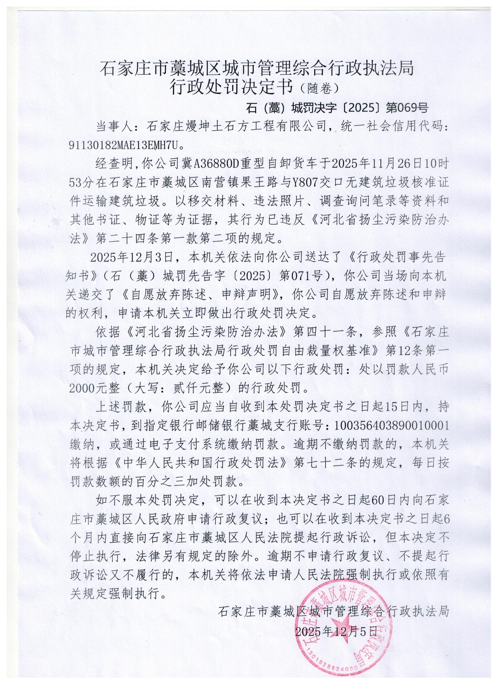 藁城区城市管理综合行政执法局行政处罚决定书069