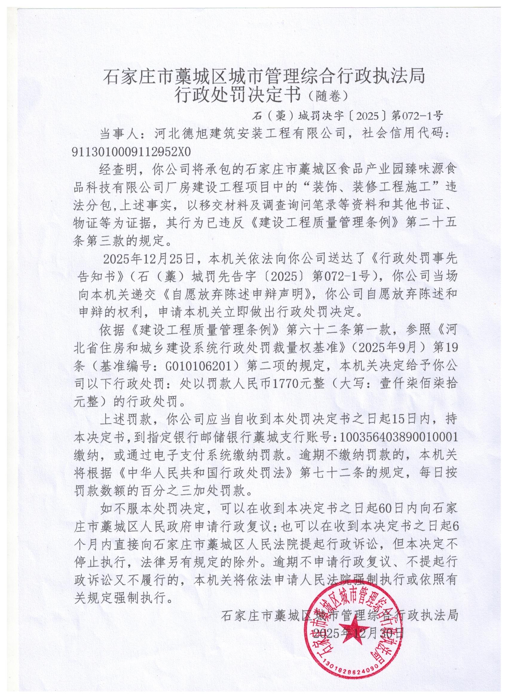 藁城区城市管理综合行政执法局行政处罚决定书072-1