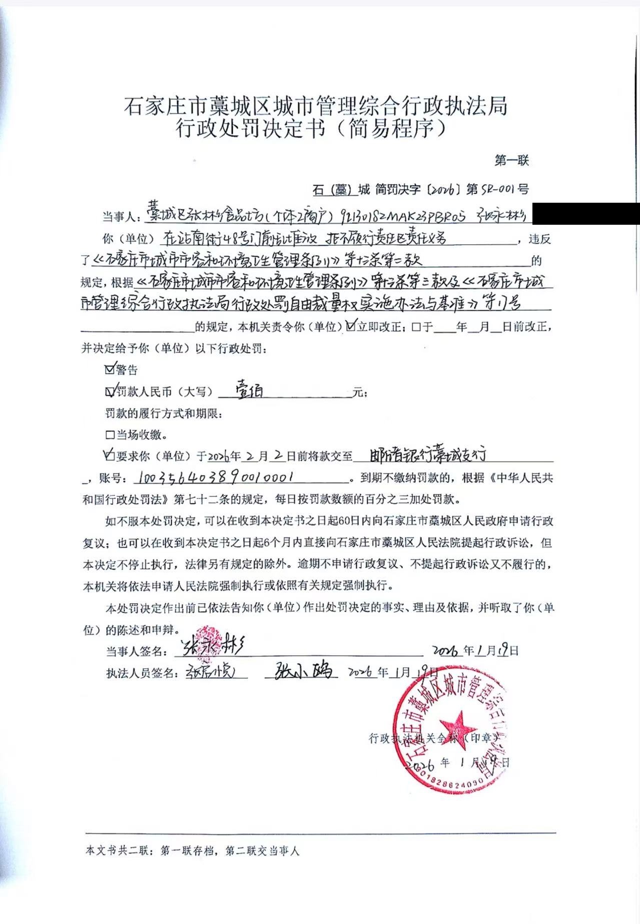 藁城区城市管理综合行政执法局行政处罚决定书简易SR-001