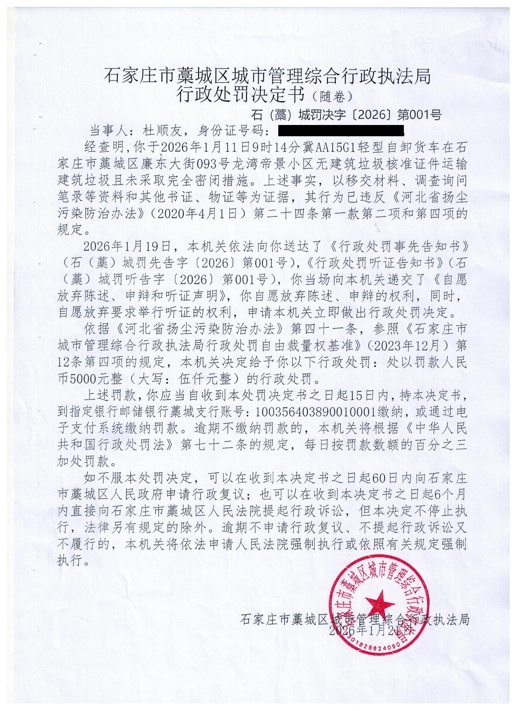 藁城区城市管理综合行政执法局行政处罚决定书001