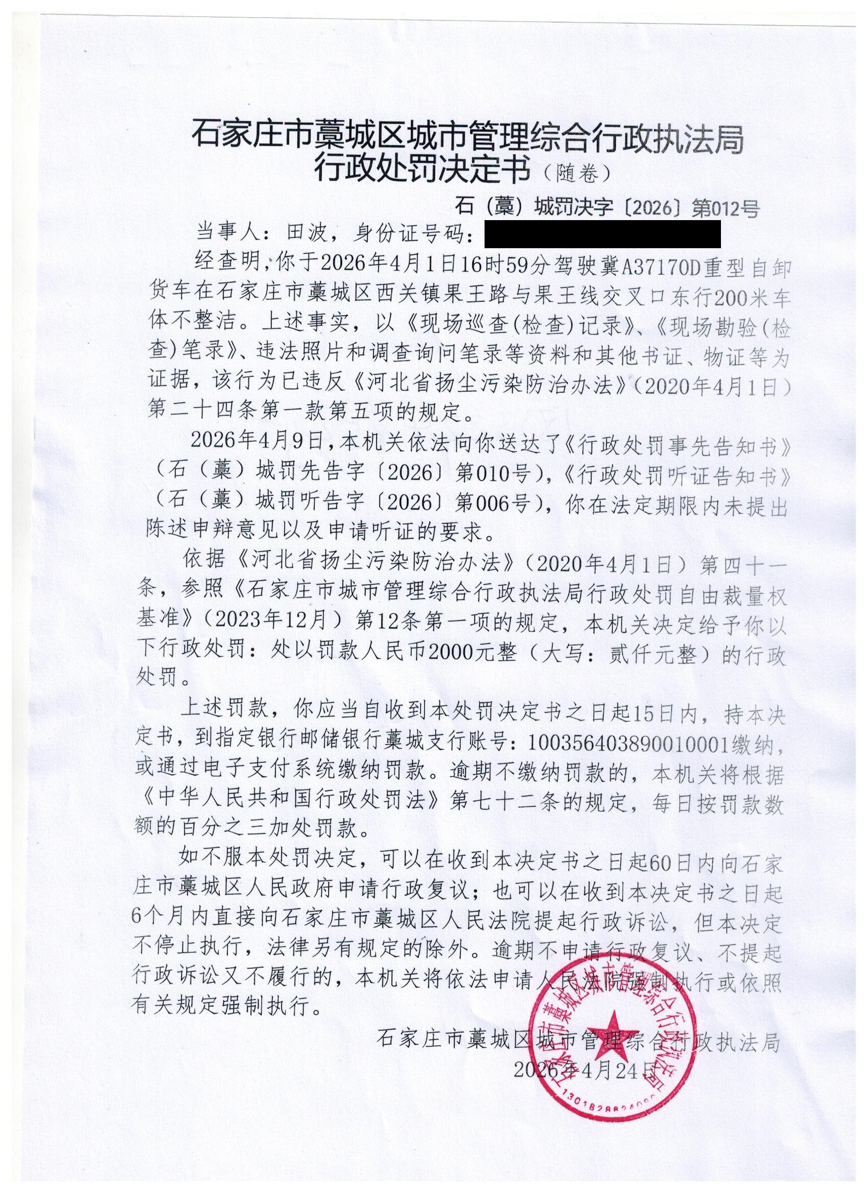 藁城区城市管理综合行政执法局行政处罚决定书012