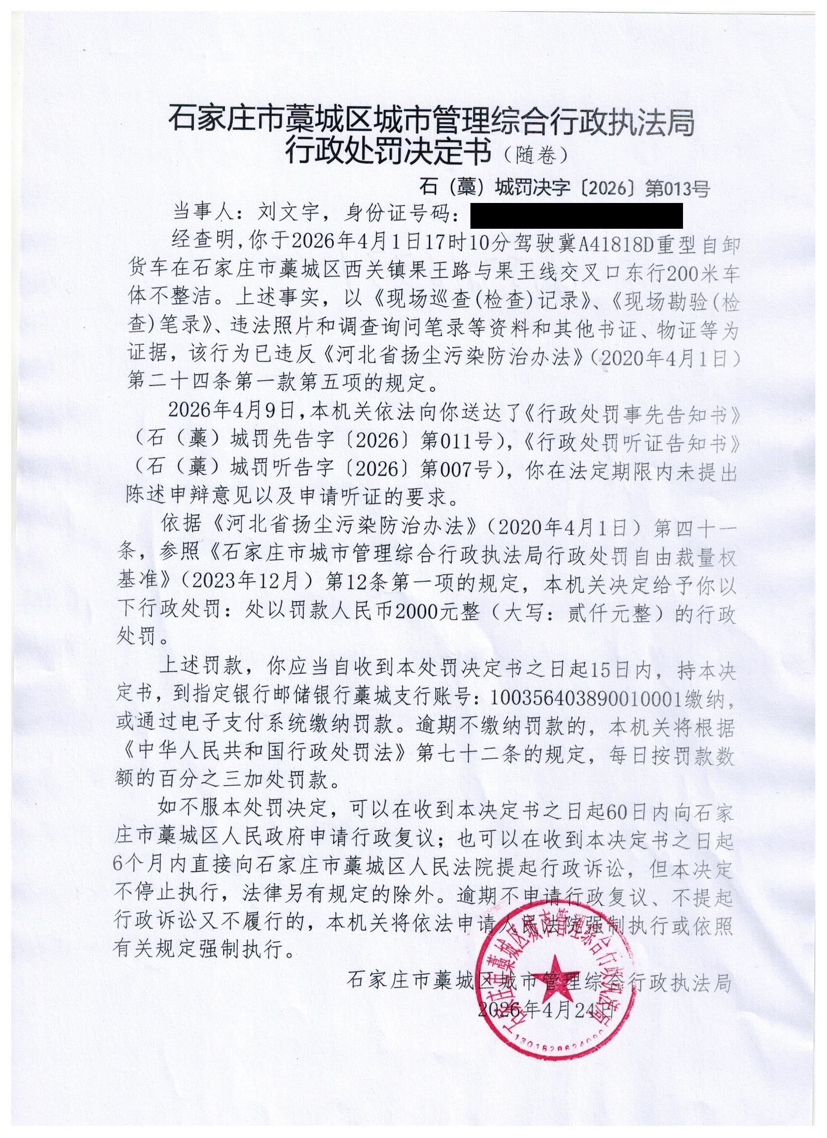 藁城区城市管理综合行政执法局行政处罚决定书013