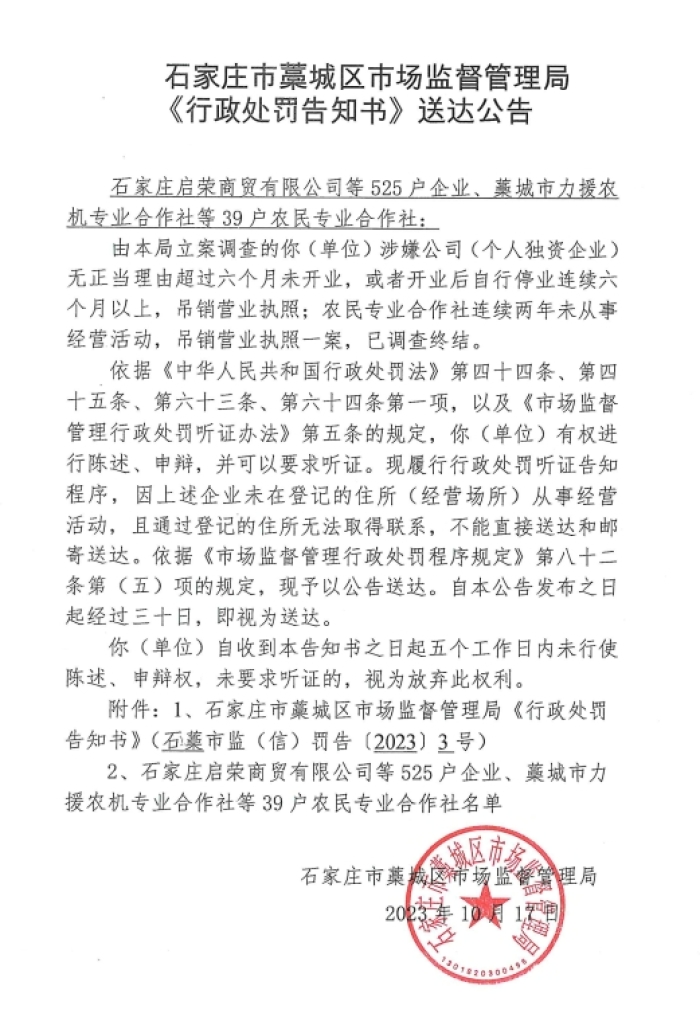 石家庄市藁城区市场监督管理局《行政处罚告知书》送达公告