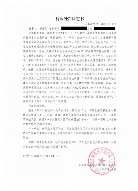 石藁增罚决【2024】5-1号 郝分队随意堆放生活垃圾行政处罚决定书