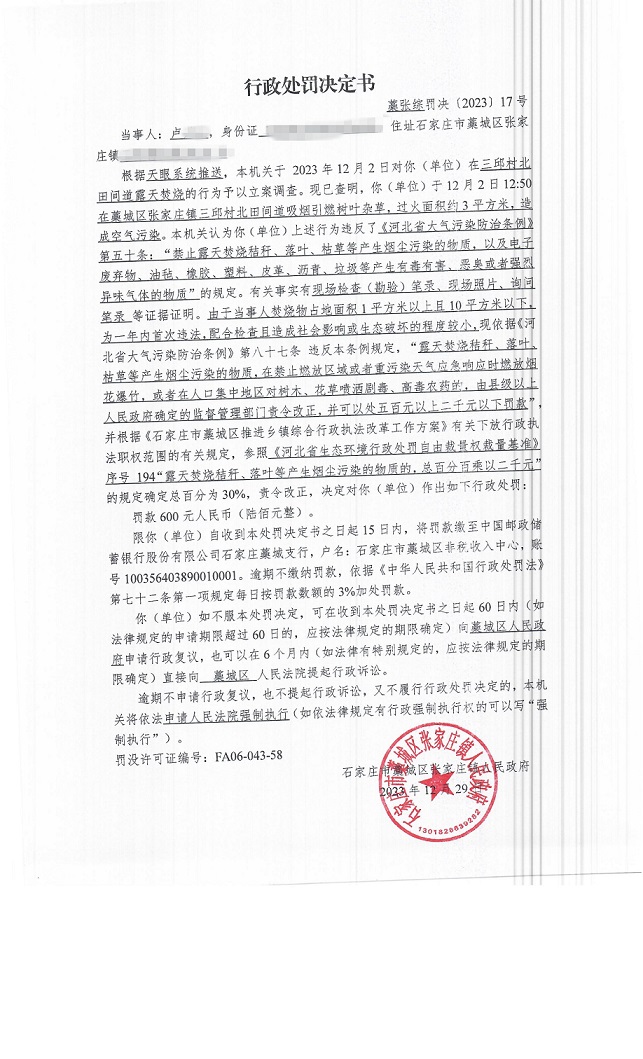 藁张综罚决〔2023〕17号三邱村卢兴卫露天焚烧案